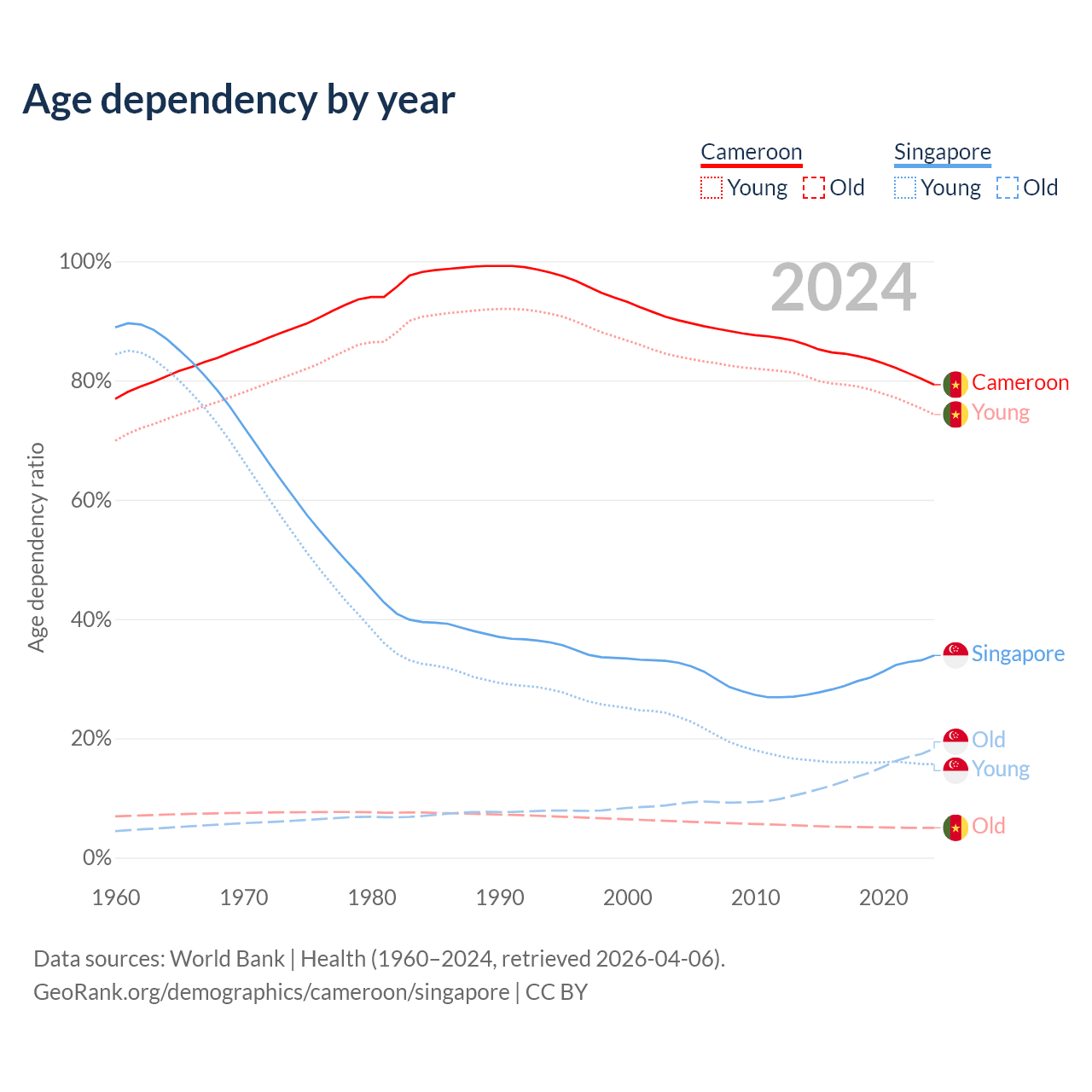 - Cameroon is ranked 180/196 by median age (oldest to youngest) vs 68/196 for Singapore.