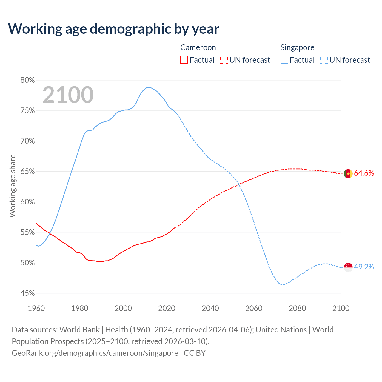 - Cameroon has 17.2M working age adults (aged 15-64) vs 4.57M in Singapore.