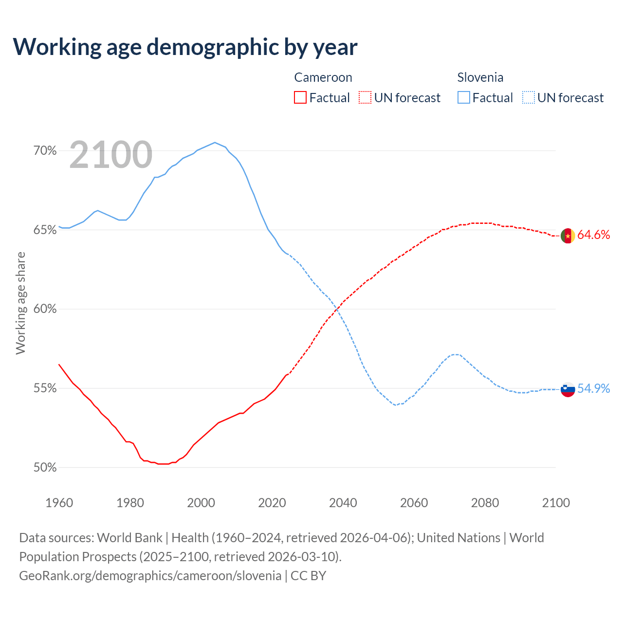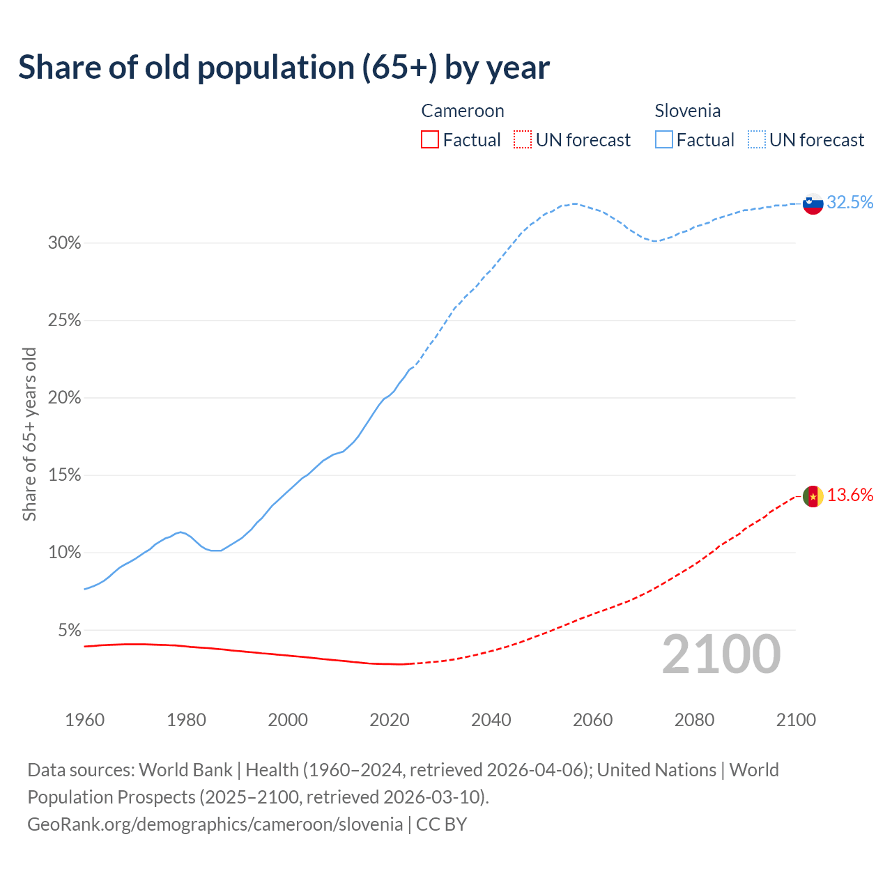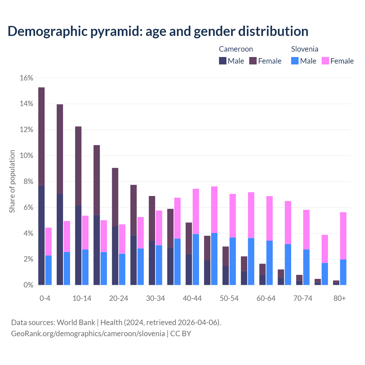 The share of older people aged 65 and over is 2.79% in Cameroon and 21.8% in Slovenia. Life expectancy in Cameroon compared to Slovenia .