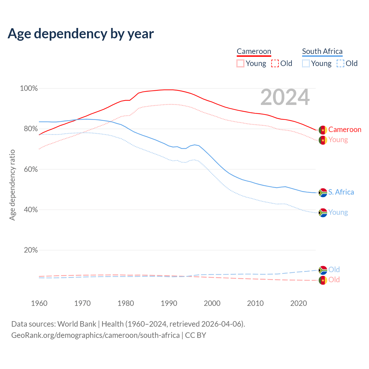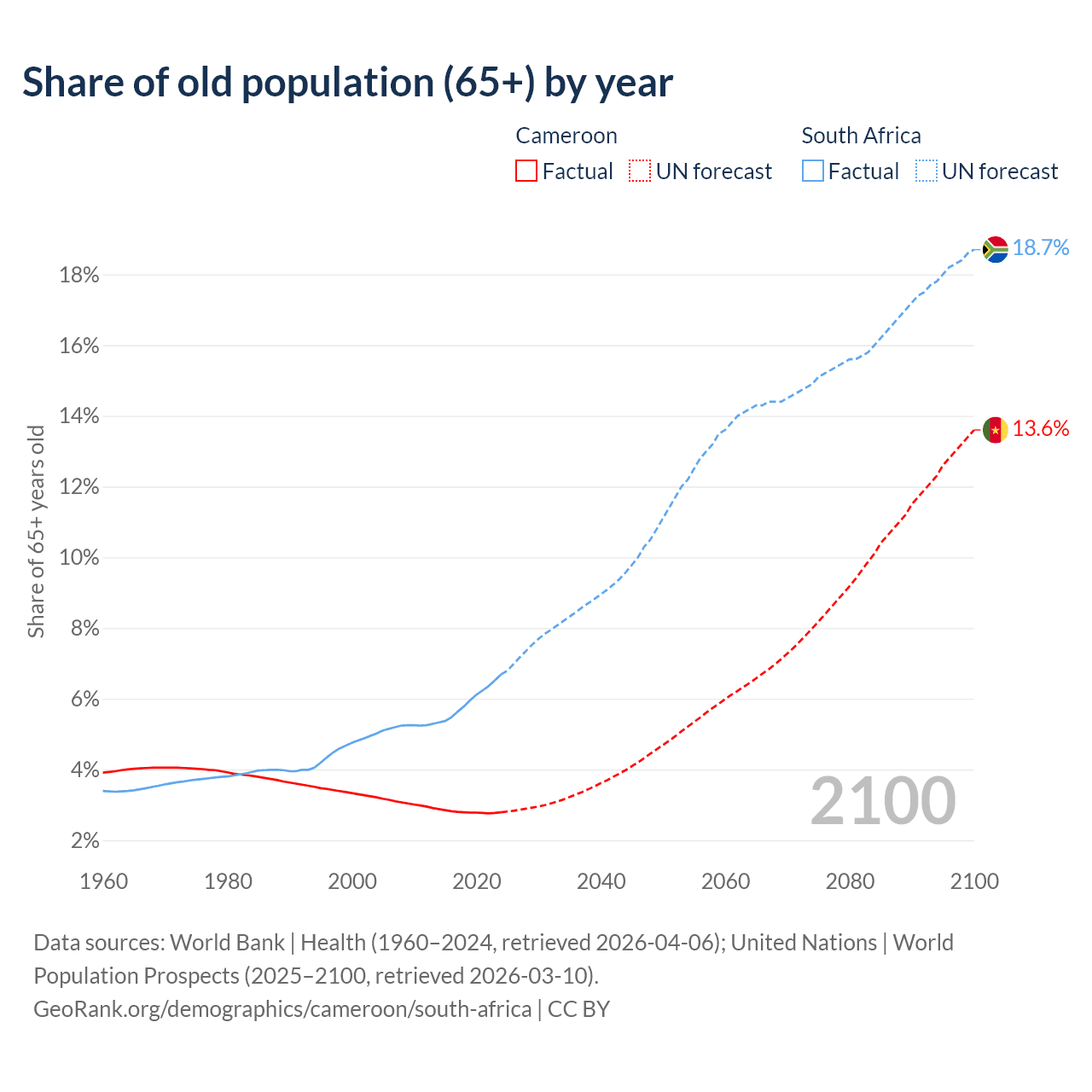 The share of older people aged 65 and over is 2.79% in Cameroon and 6.69% in South Africa. Life expectancy in Cameroon compared to South Africa .