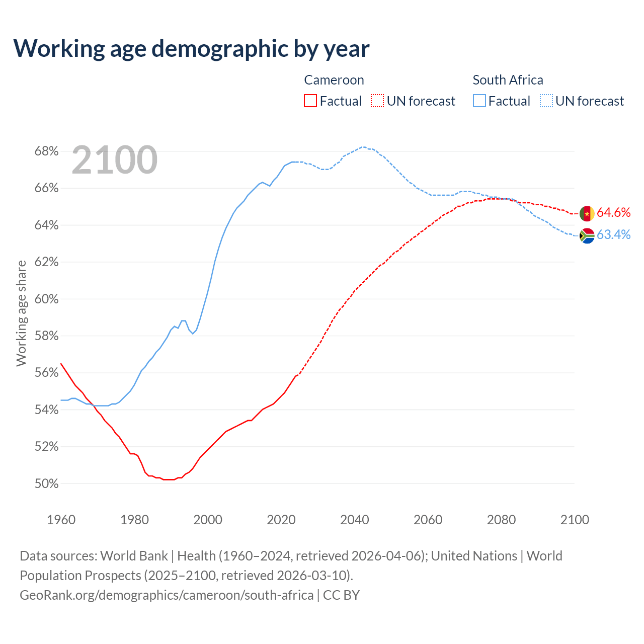 - Cameroon has 17.2M working age adults (aged 15-64) vs 44.3M in South Africa.