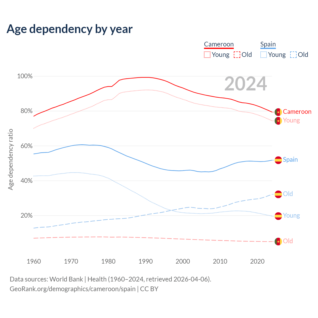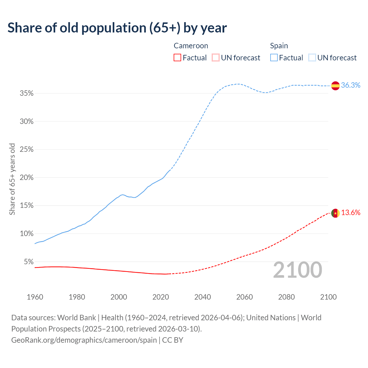 The share of older people aged 65 and over is 2.79% in Cameroon and 21.1% in Spain. Life expectancy in Cameroon compared to Spain .