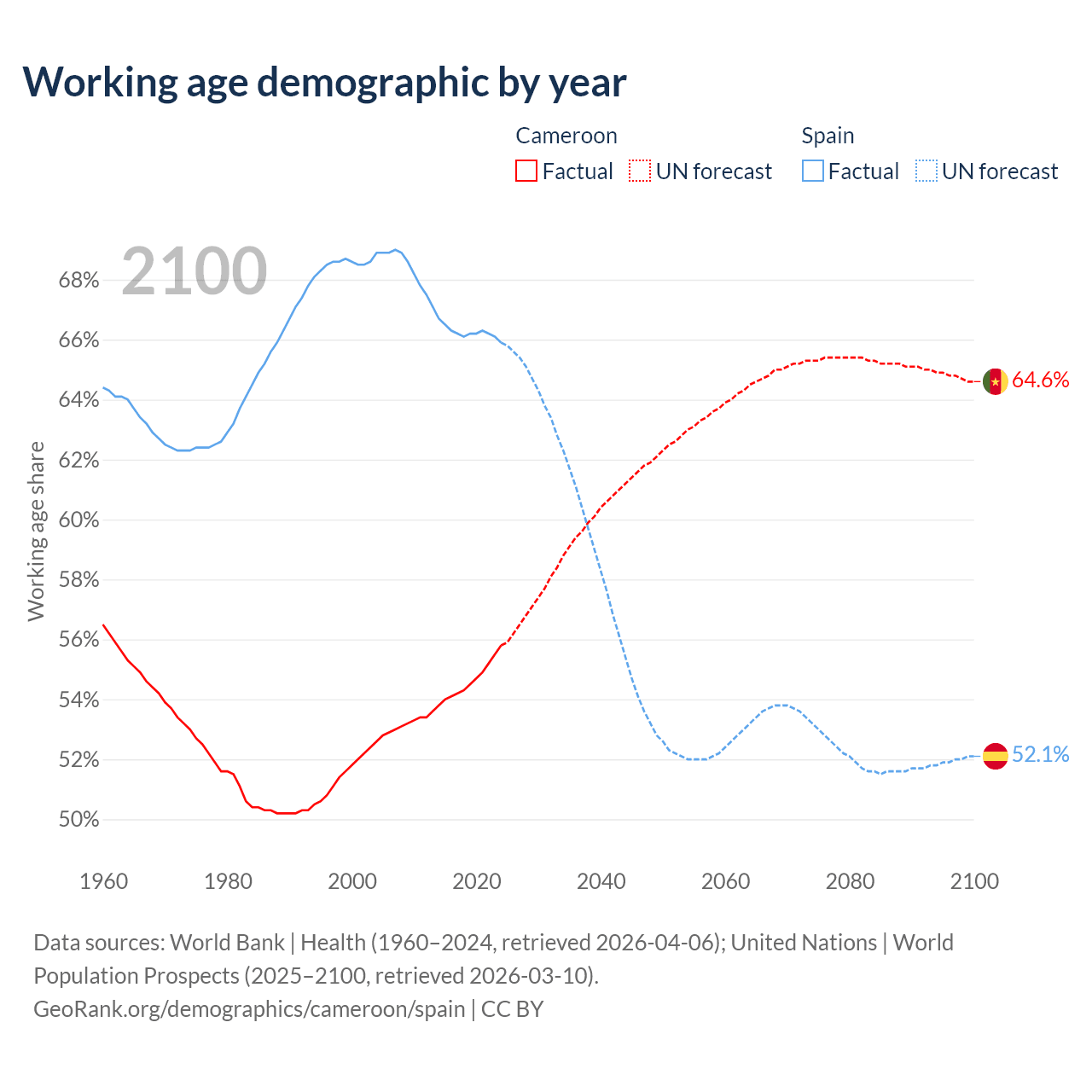 - Cameroon has 17.2M working age adults (aged 15-64) vs 32.2M in Spain.