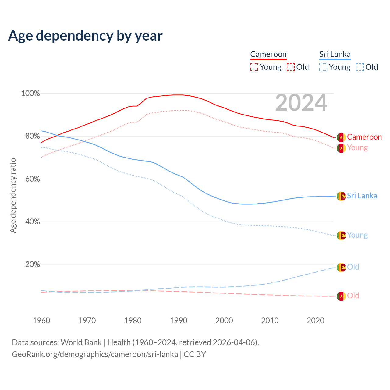 The share of older people aged 65 and over is 2.79% in Cameroon and 12.1% in Sri Lanka. Life expectancy in Cameroon compared to Sri Lanka .