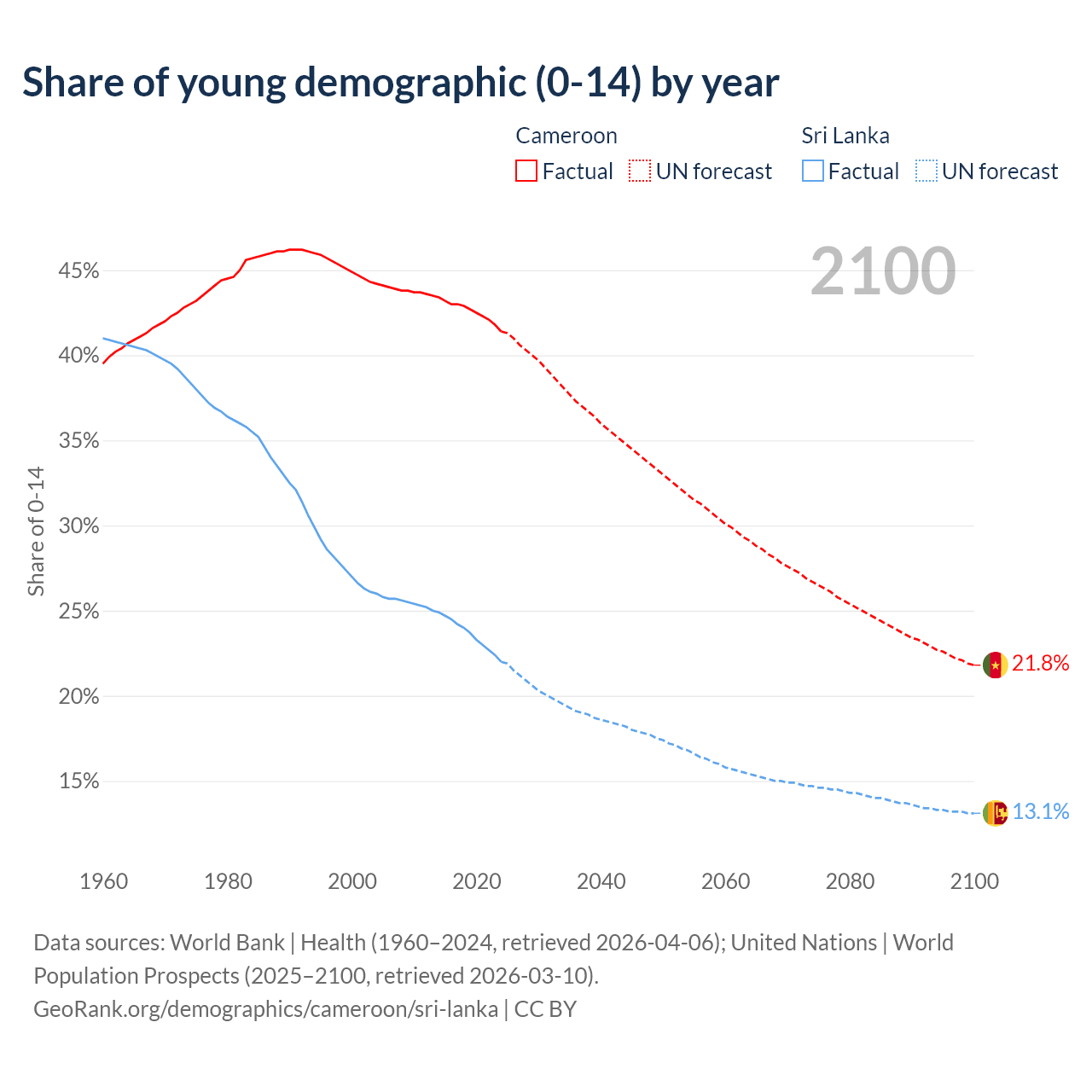 - The share of young demographic (0-15 years old) in Cameroon is 41.4% vs 22% in Sri Lanka.