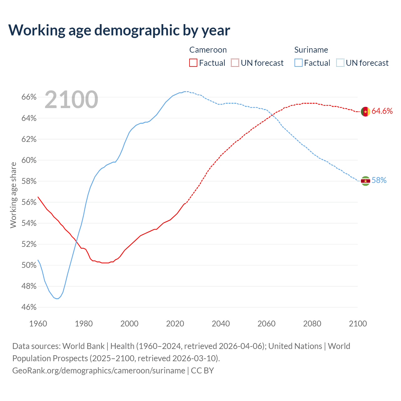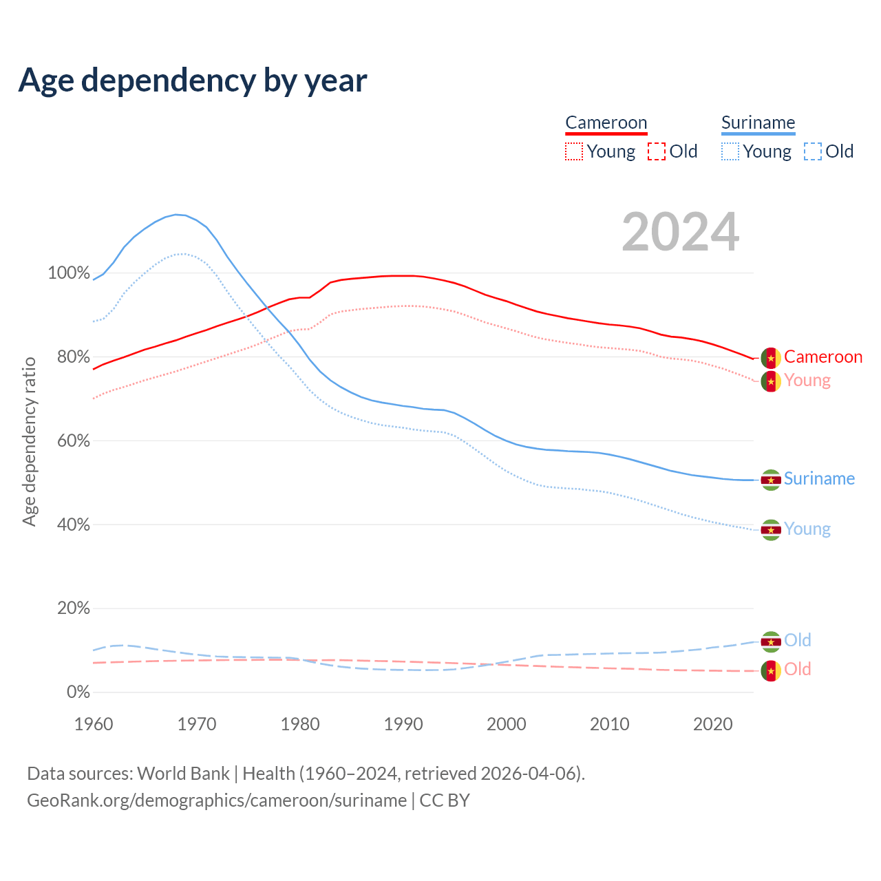 The share of older people aged 65 and over is 2.79% in Cameroon and 7.9% in Suriname. Life expectancy in Cameroon compared to Suriname .