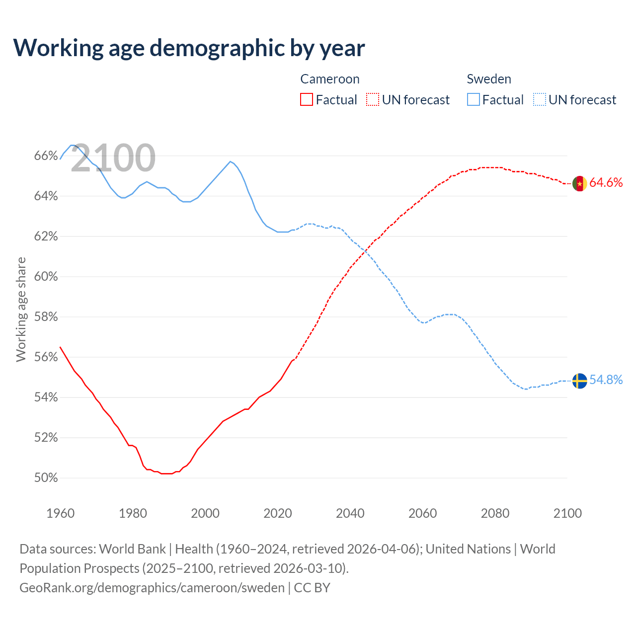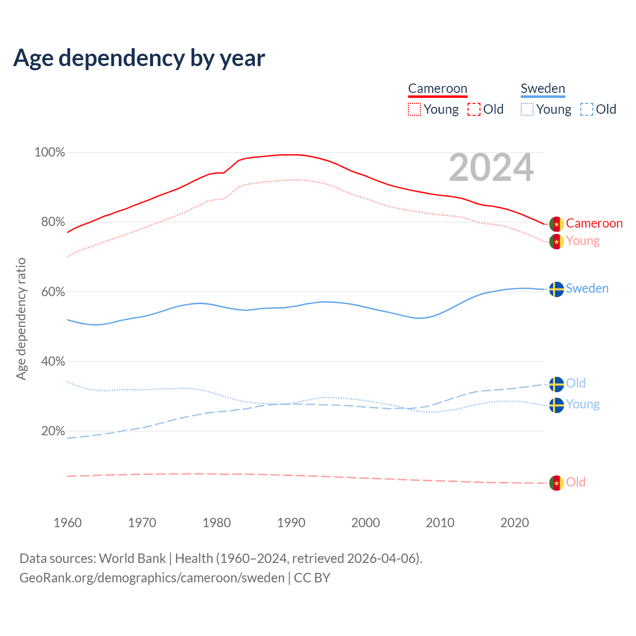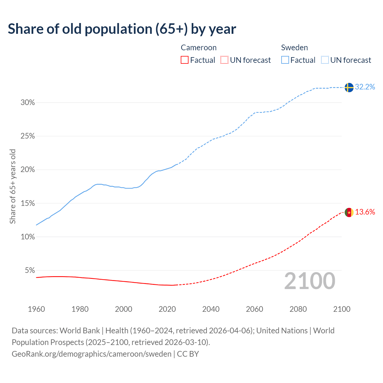 The share of older people aged 65 and over is 2.79% in Cameroon and 20.7% in Sweden. Life expectancy in Cameroon compared to Sweden .