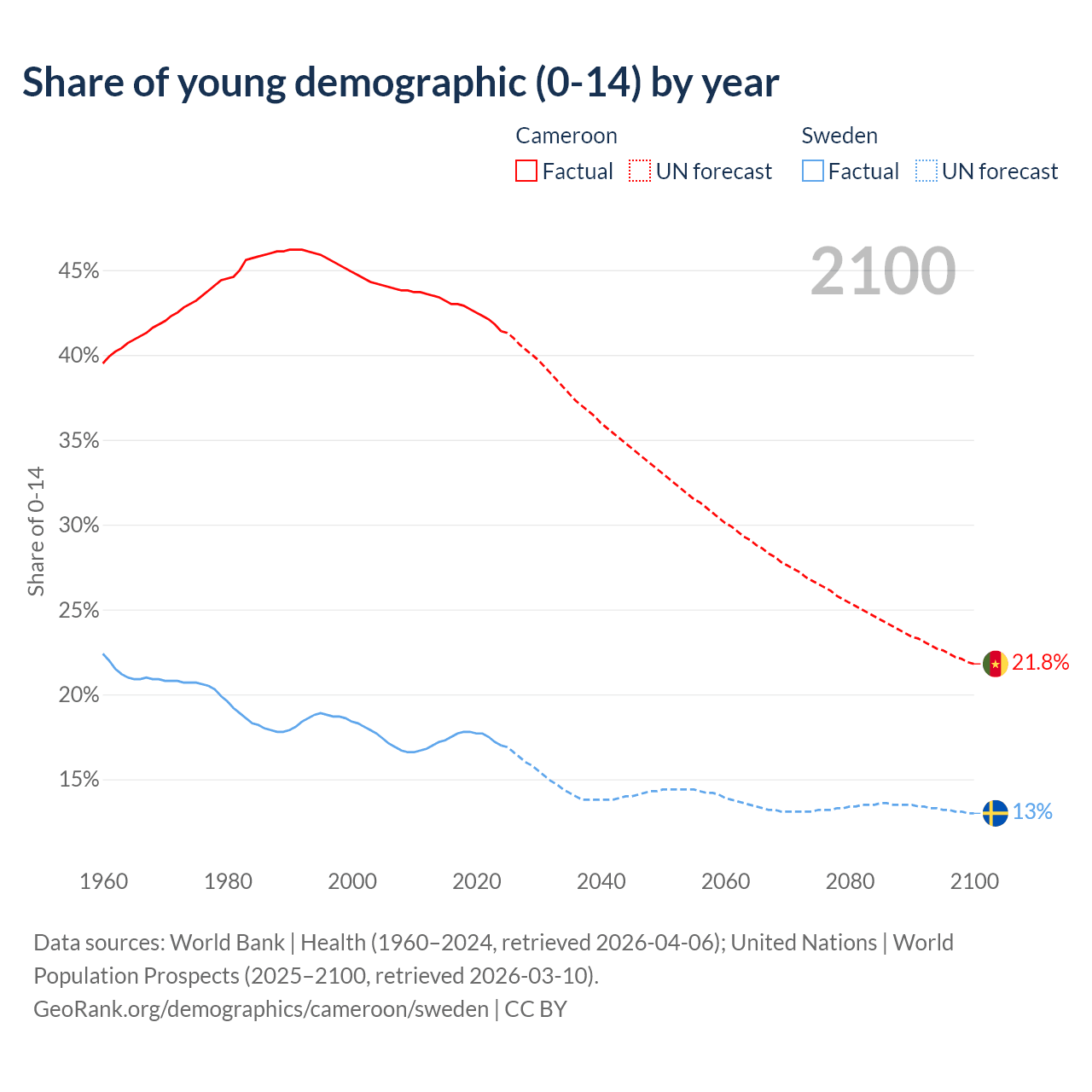 - The share of young demographic (0-15 years old) in Cameroon is 41.4% vs 17% in Sweden.