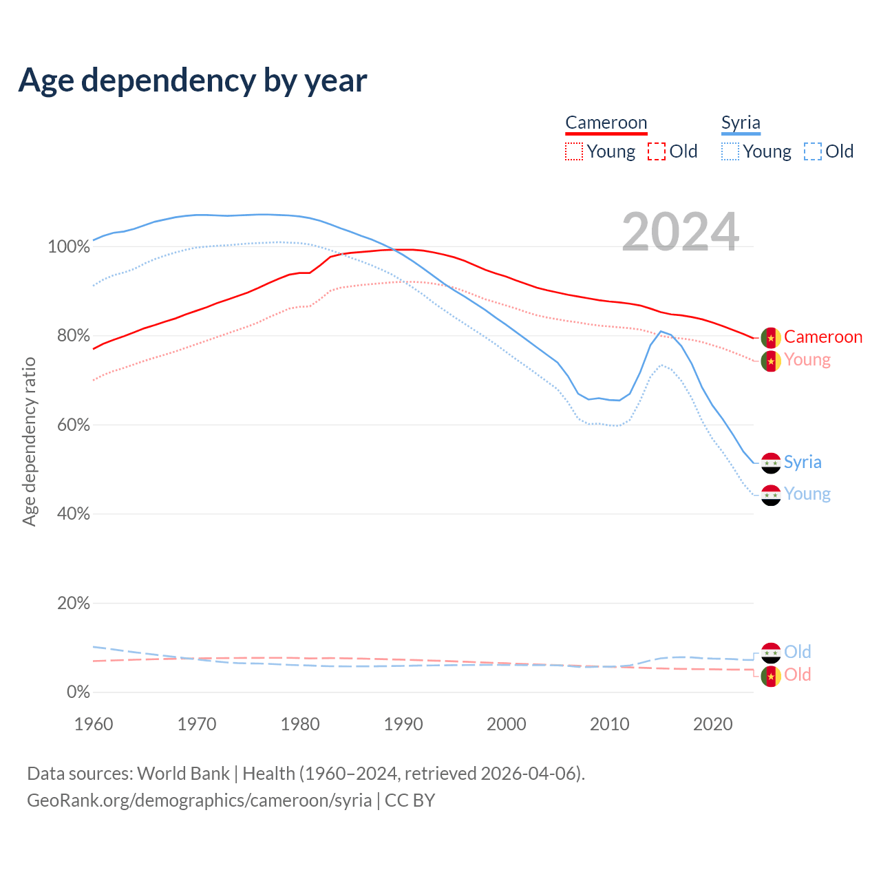 - The share of old-age demographic (65+) in Cameroon is 2.79% vs 4.74% in Syria.