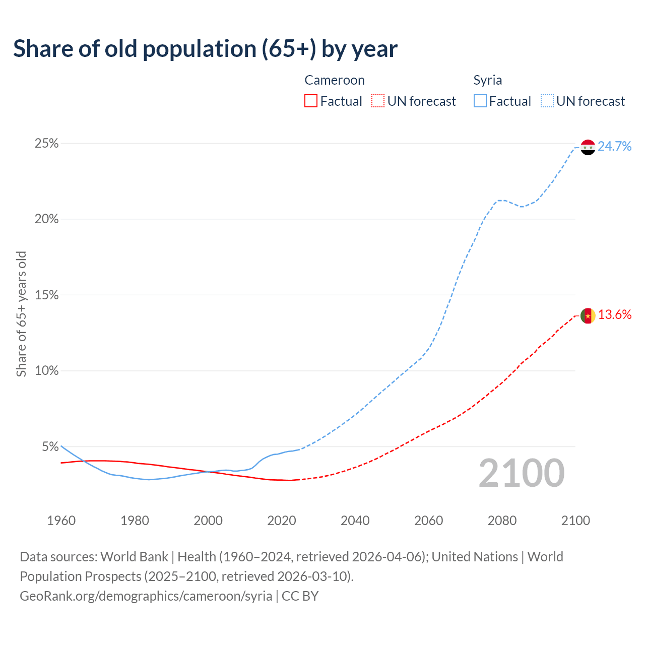 The share of older people aged 65 and over is 2.79% in Cameroon and 4.74% in Syria. Life expectancy in Cameroon compared to Syria .
