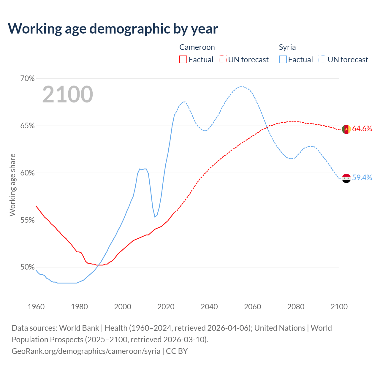 - Cameroon has 17.2M working age adults (aged 15-64) vs 17.7M in Syria.