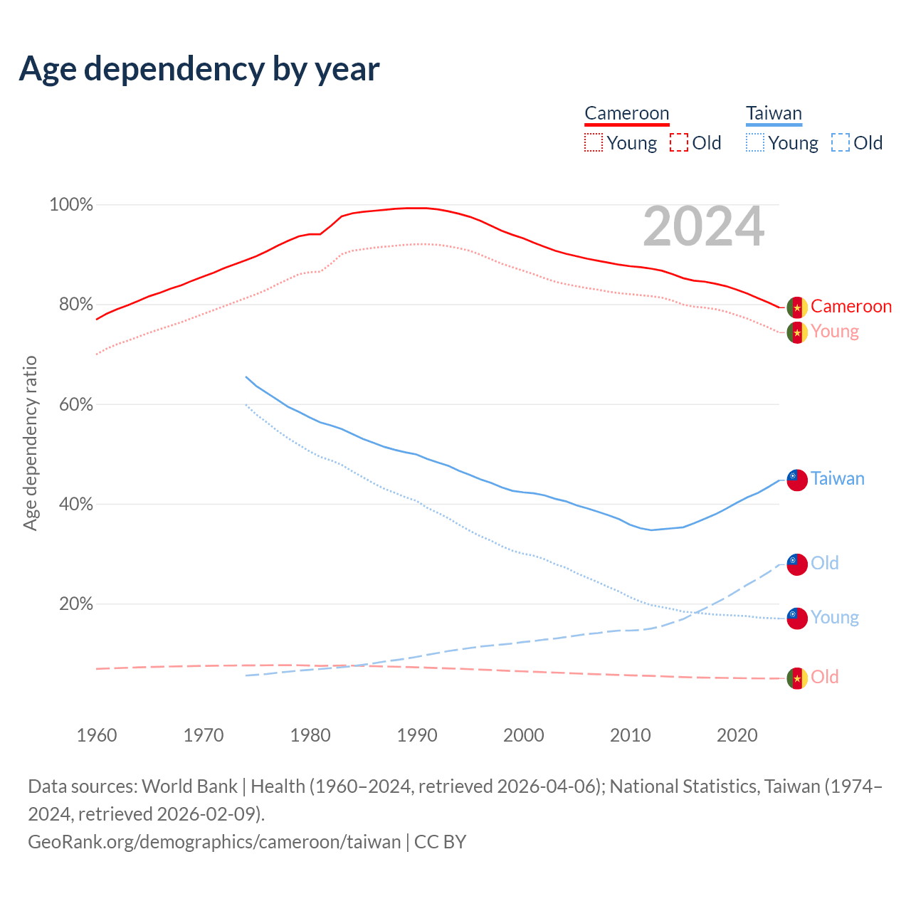 Data sources: World Bank | Health (1960–2024, retrieved 2026-04-06); U.S. Census Bureau (1960–2024, retrieved 2026-02-08); National Statistics, Taiwan (1974–2024, retrieved 2026-02-09).