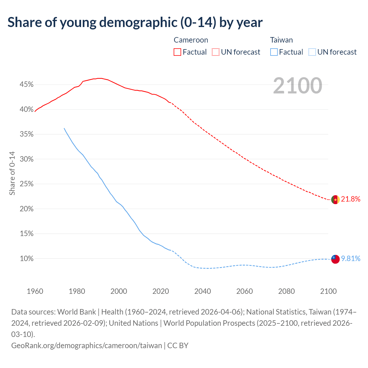 - The share of young demographic (0-15 years old) in Cameroon is 41.4% vs 11.7% in Taiwan.