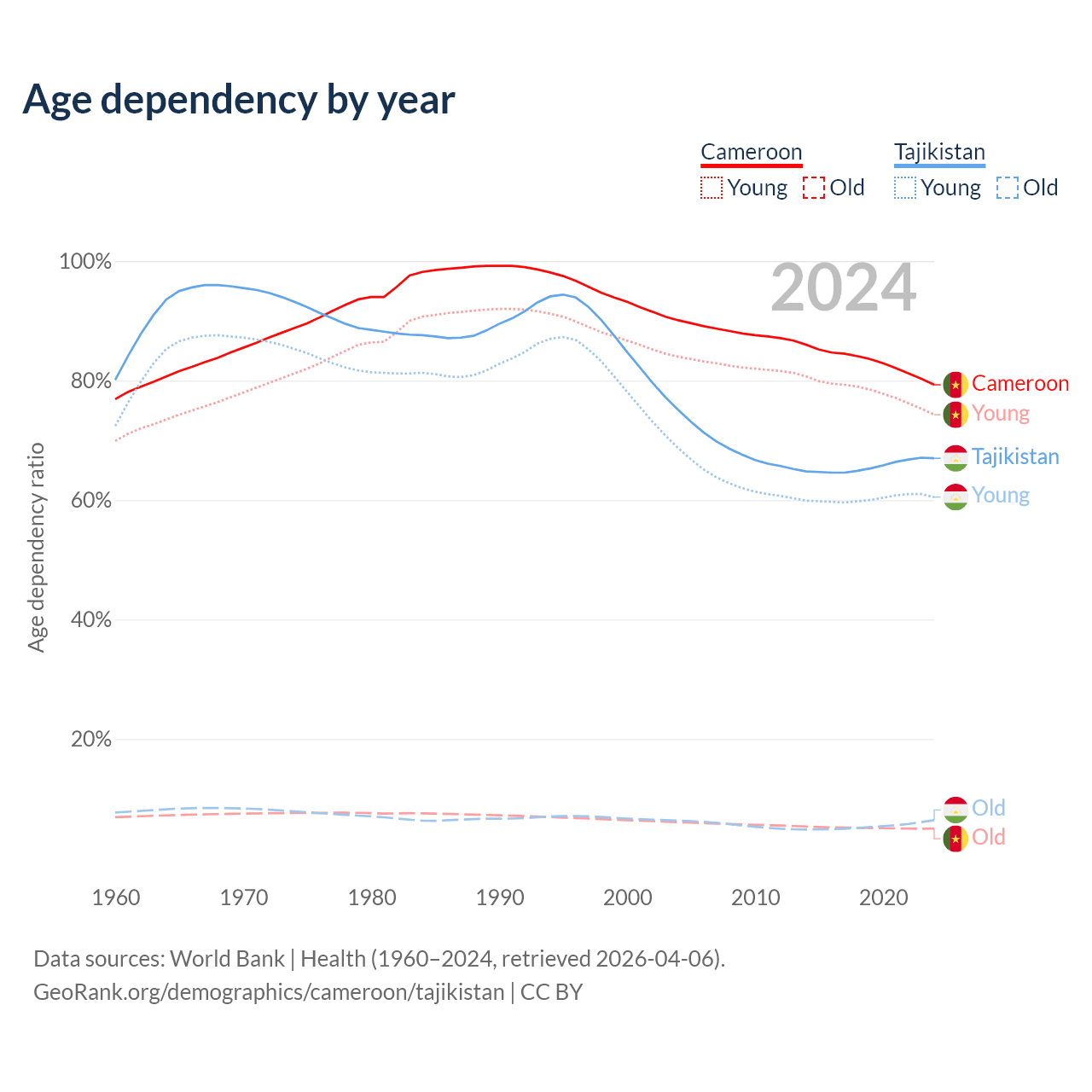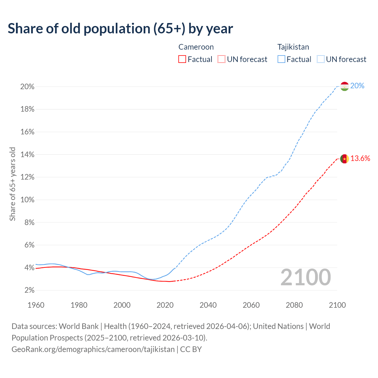The share of older people aged 65 and over is 2.79% in Cameroon and 3.85% in Tajikistan. Life expectancy in Cameroon compared to Tajikistan .