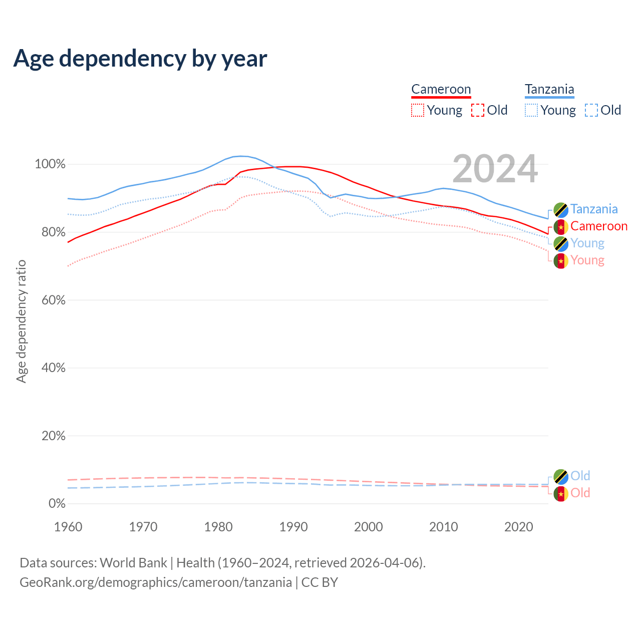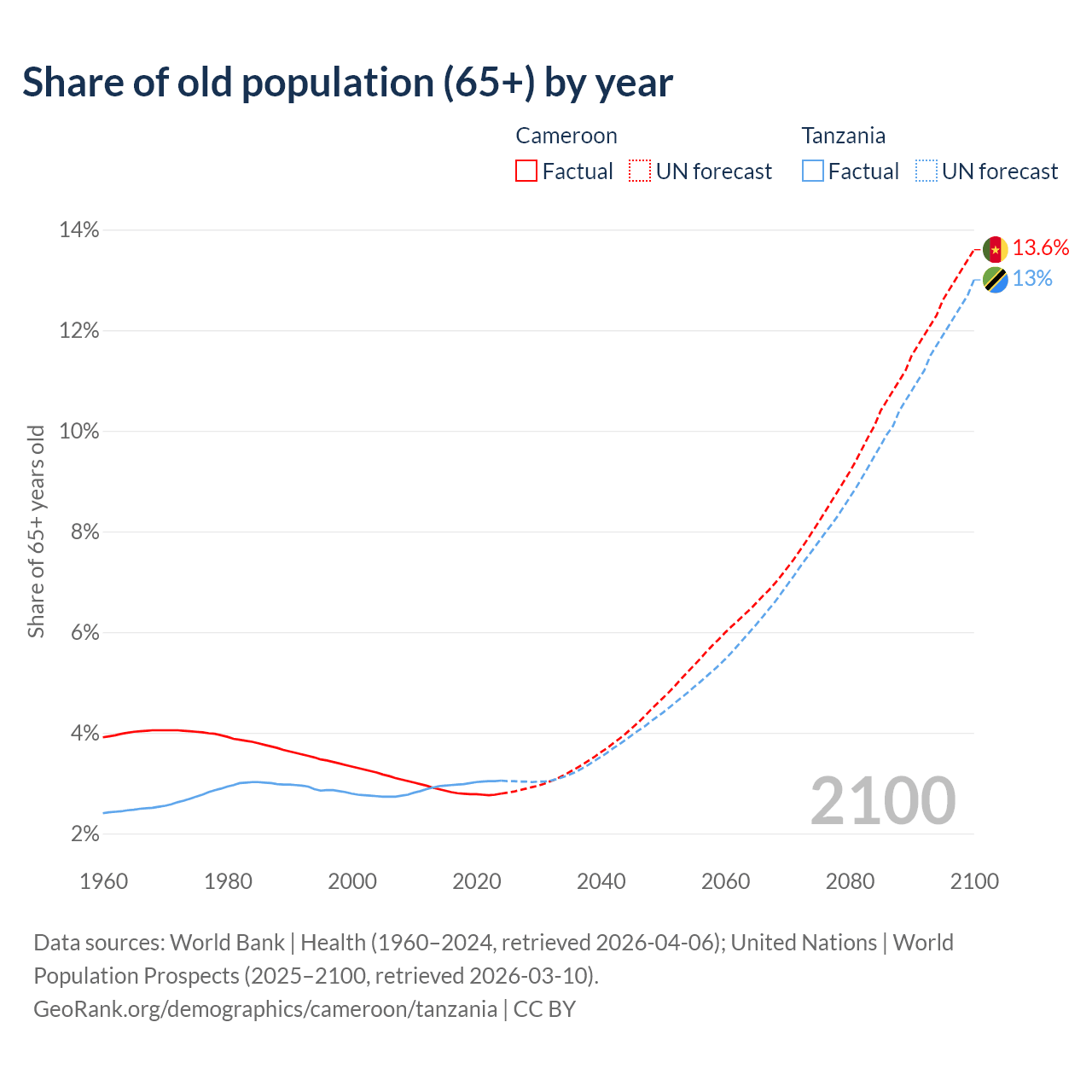 The share of older people aged 65 and over is 2.79% in Cameroon and 3.05% in Tanzania. Life expectancy in Cameroon compared to Tanzania .