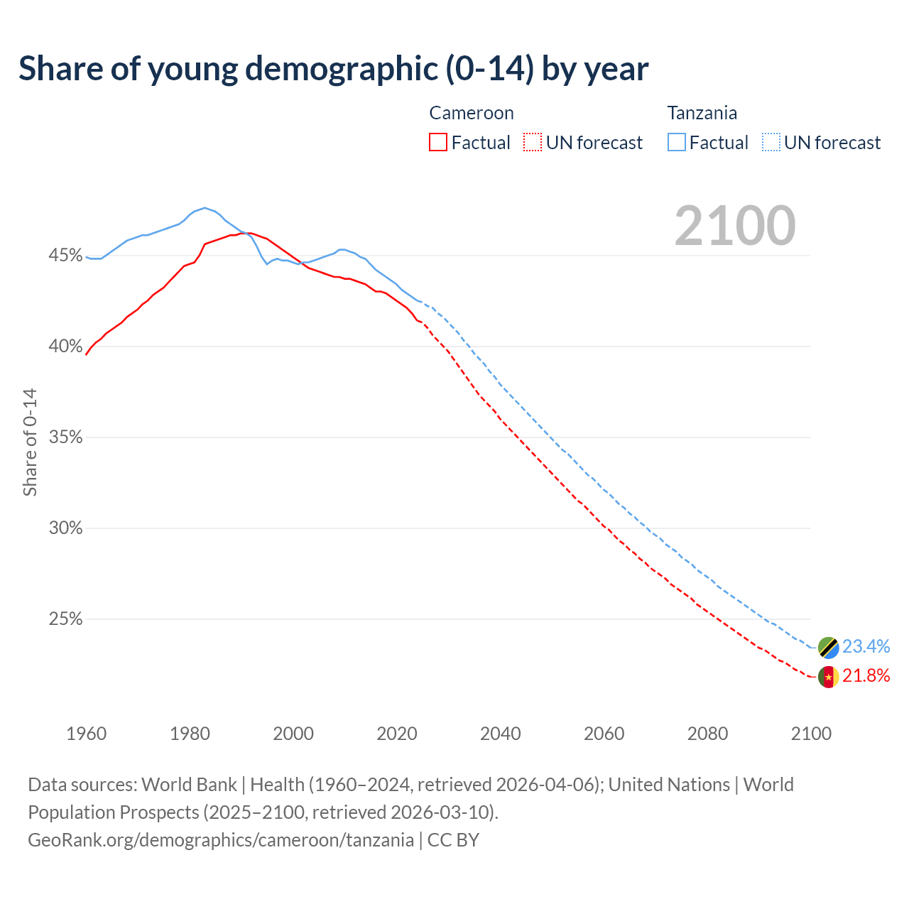 Median age Cameroon vs Tanzania, 1960-2100