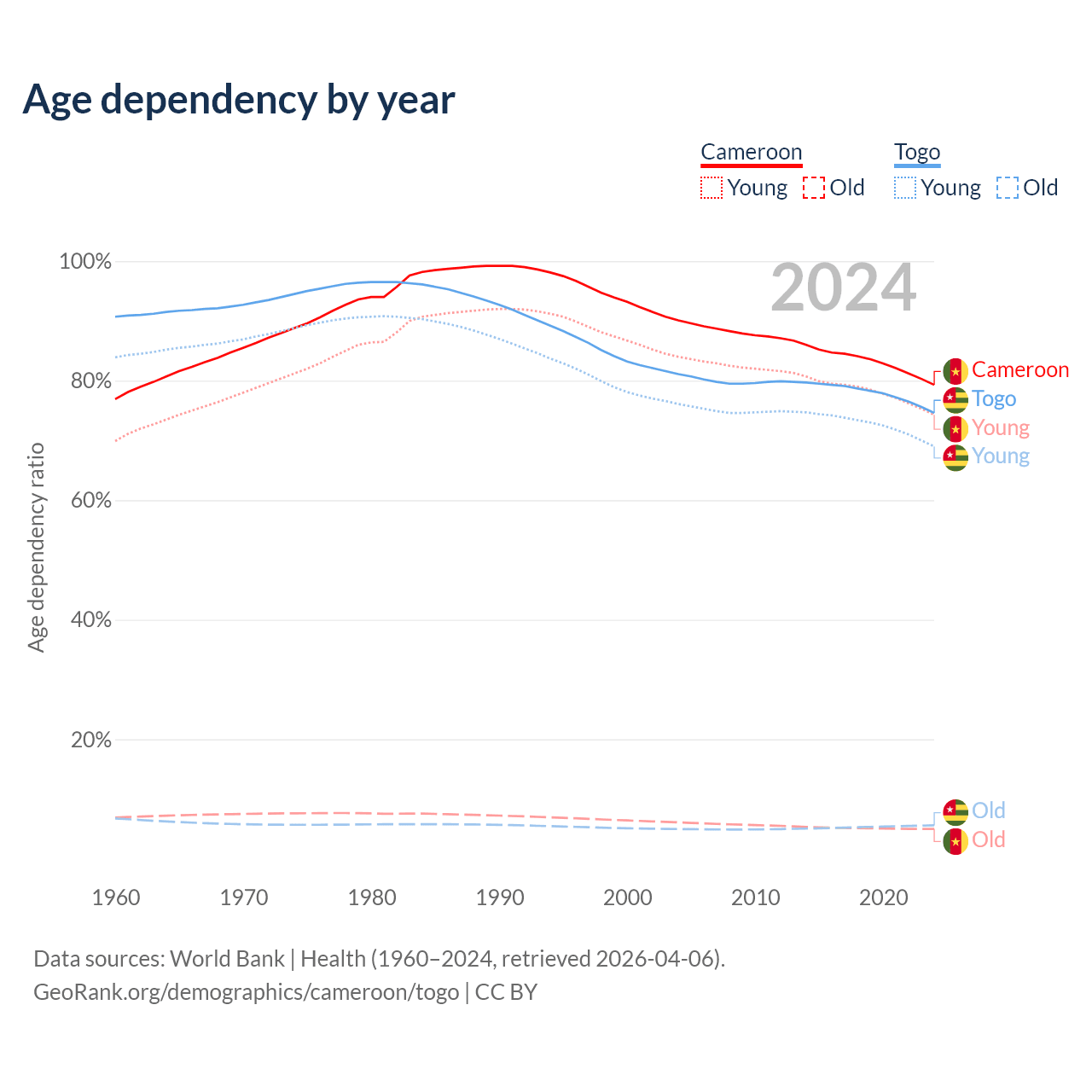 - Cameroon is ranked 180/196 by median age (oldest to youngest) vs 166/196 for Togo.