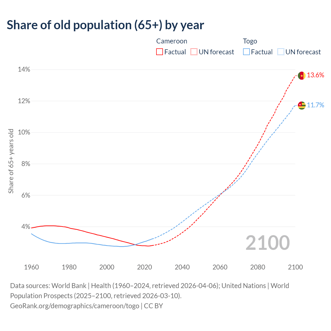 The share of older people aged 65 and over is 2.79% in Cameroon and 3.21% in Togo. Life expectancy in Cameroon compared to Togo .