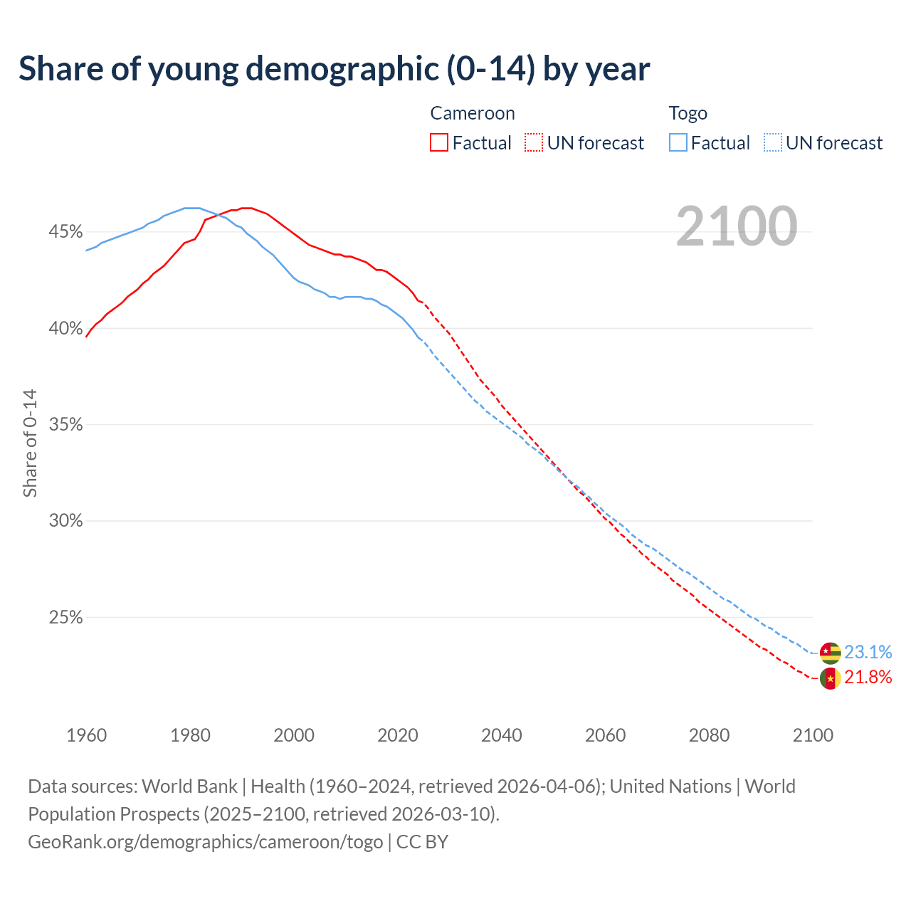 - The share of young demographic (0-15 years old) in Cameroon is 41.4% vs 39.5% in Togo.