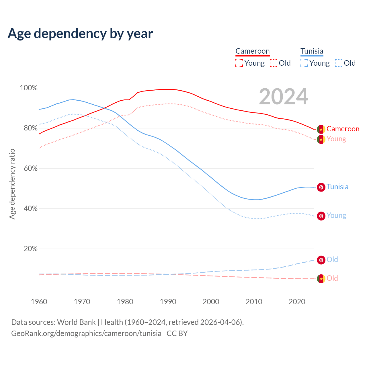 The share of older people aged 65 and over is 2.79% in Cameroon and 9.53% in Tunisia. Life expectancy in Cameroon compared to Tunisia .