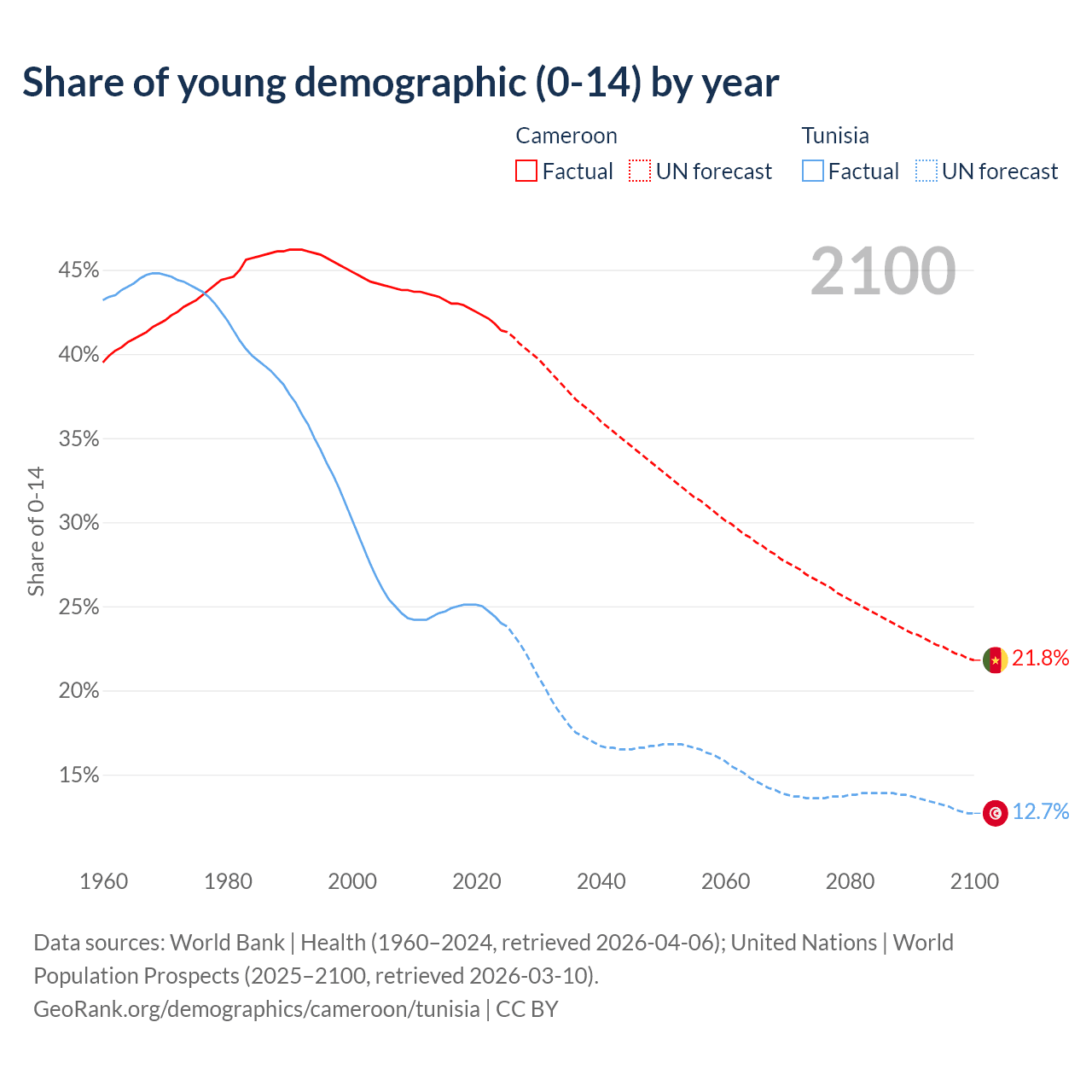 - Cameroon is ranked 180/196 by median age (oldest to youngest) vs 86/196 for Tunisia.