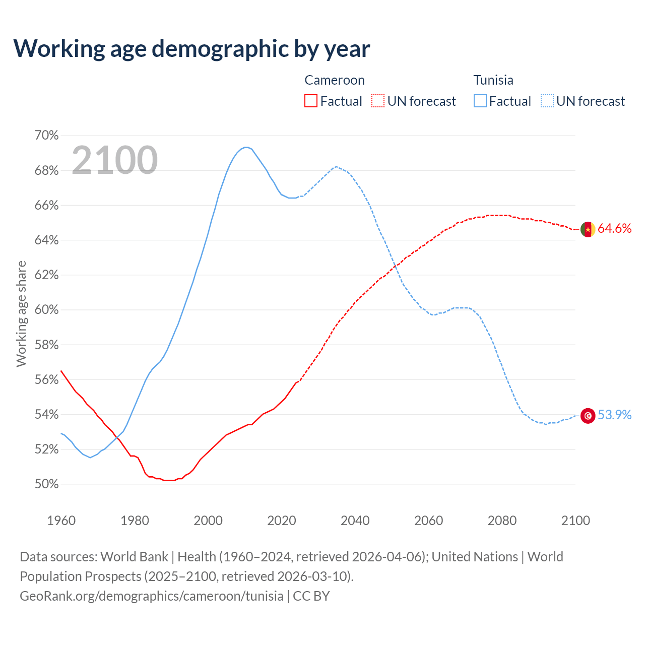 - Cameroon has 17.2M working age adults (aged 15-64) vs 8.26M in Tunisia.