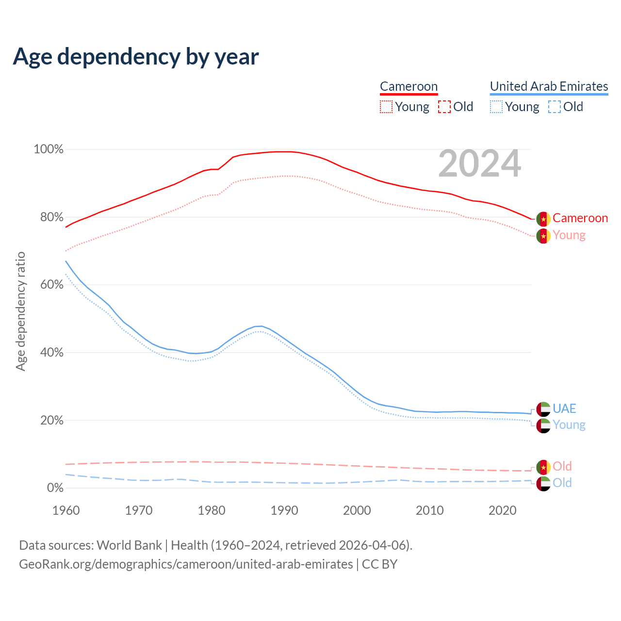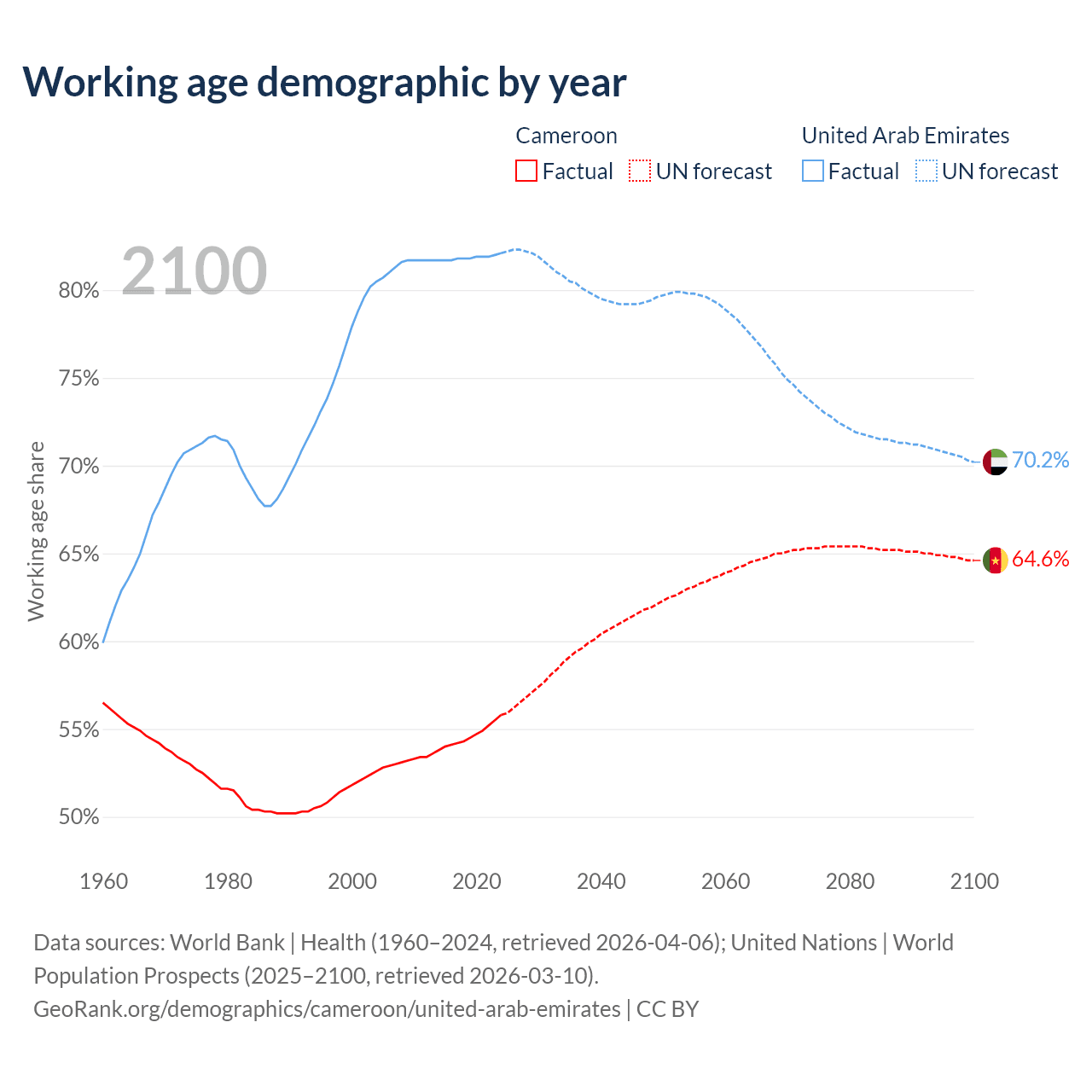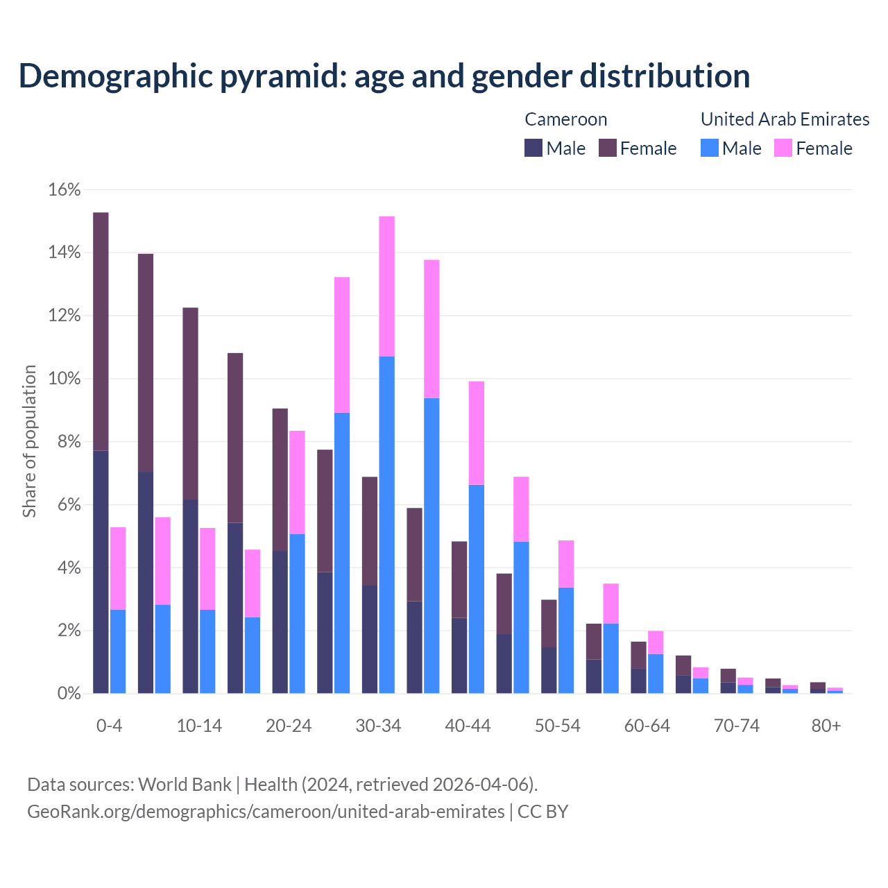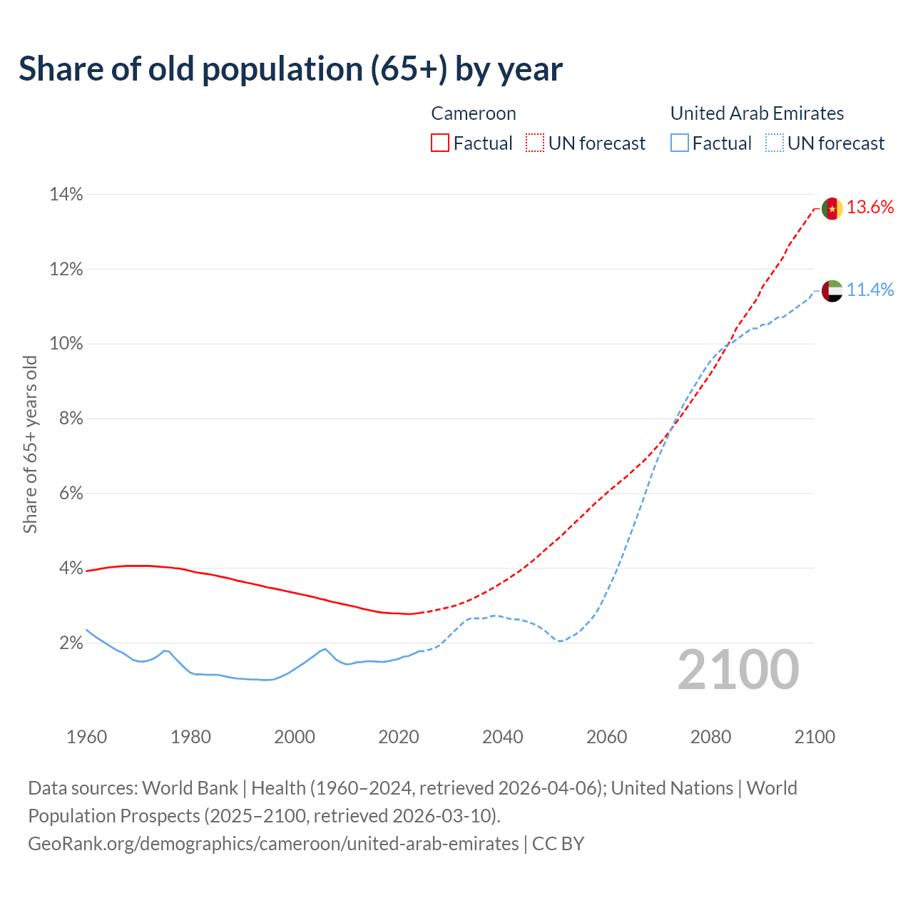 The share of older people aged 65 and over is 2.79% in Cameroon and 1.77% in the United Arab Emirates. Life expectancy in Cameroon compared to the United Arab Emirates .