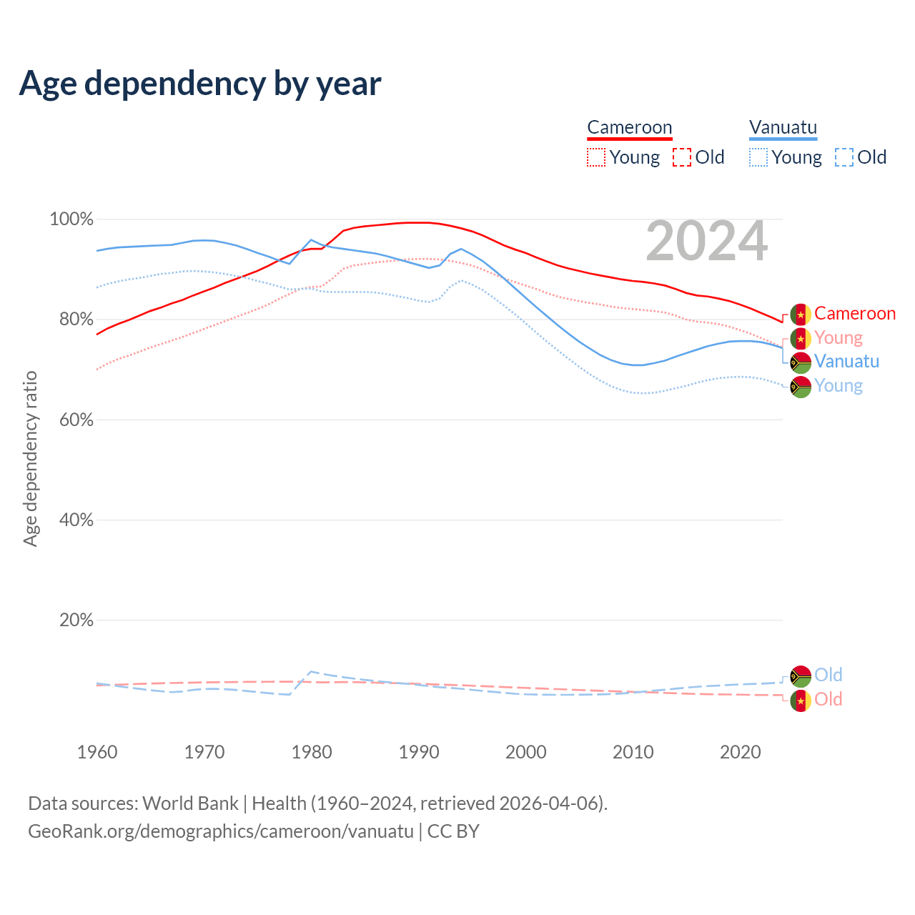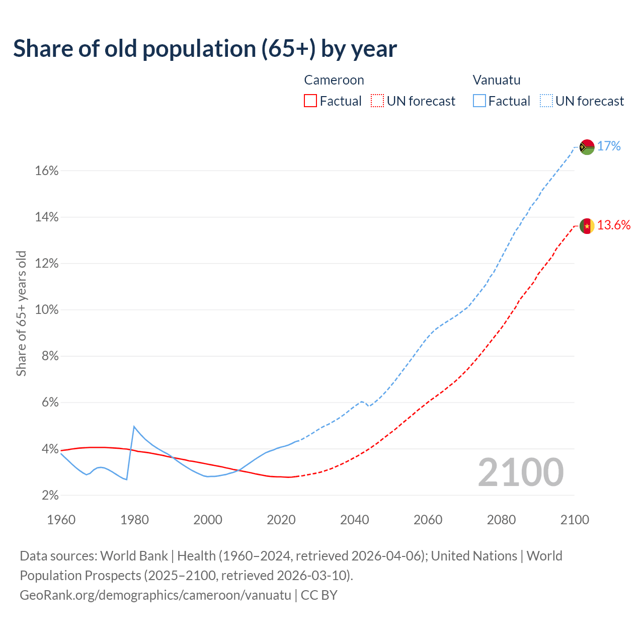The share of older people aged 65 and over is 2.79% in Cameroon and 4.3% in Vanuatu. Life expectancy in Cameroon compared to Vanuatu .