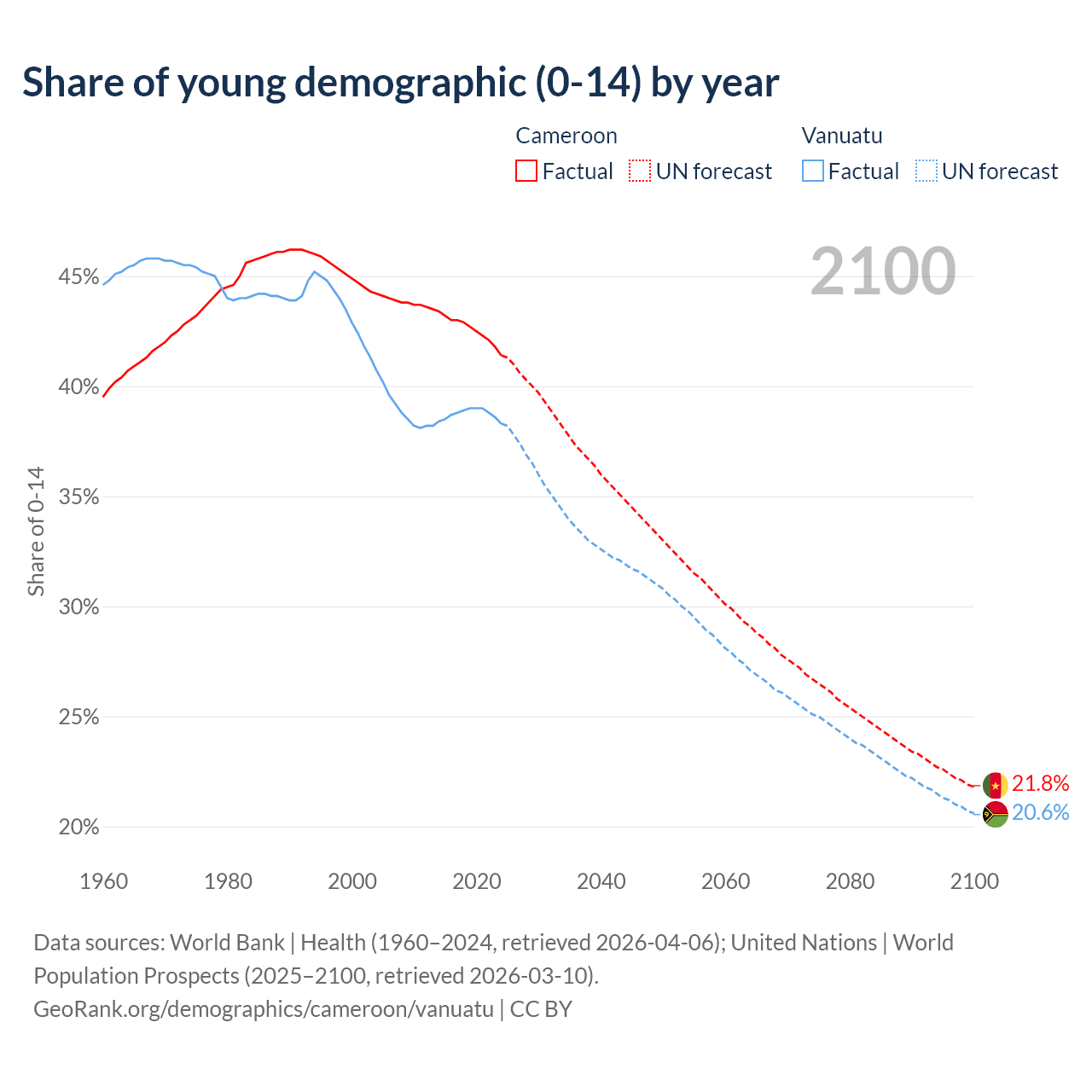 - The share of young demographic (0-15 years old) in Cameroon is 41.4% vs 38.3% in Vanuatu.