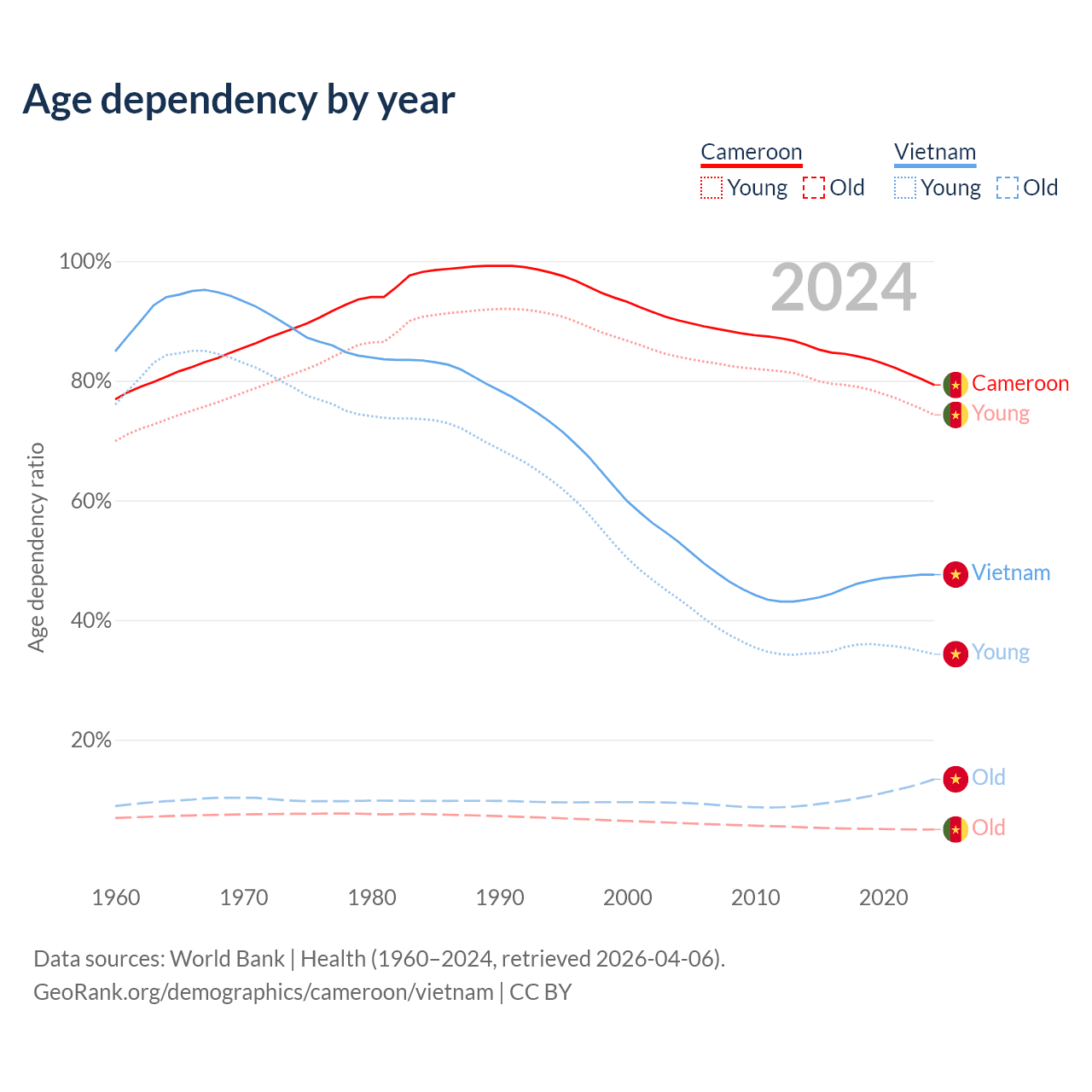 Data sources: World Bank | Health (1960–2024, retrieved 2026-04-06); U.S. Census Bureau (1960–2024, retrieved 2026-02-08).
