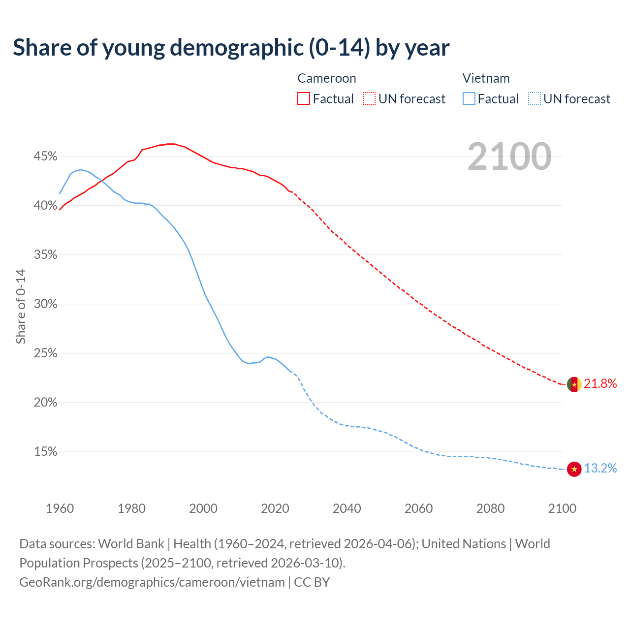 - The share of young demographic (0-15 years old) in Cameroon is 41.4% vs 23.2% in Vietnam.