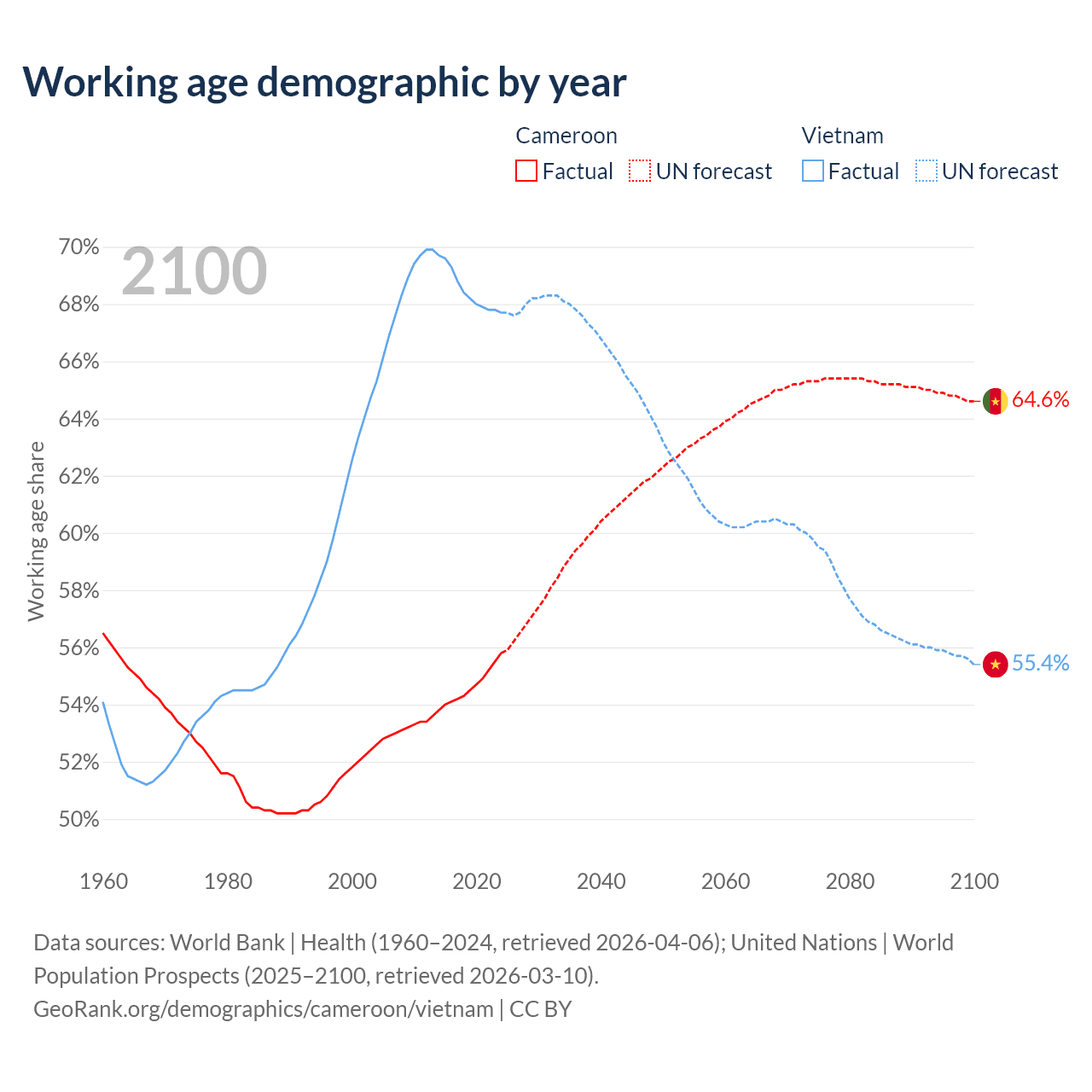 The share of older people aged 65 and over is 2.79% in Cameroon and 9.05% in Vietnam. Life expectancy in Cameroon compared to Vietnam .