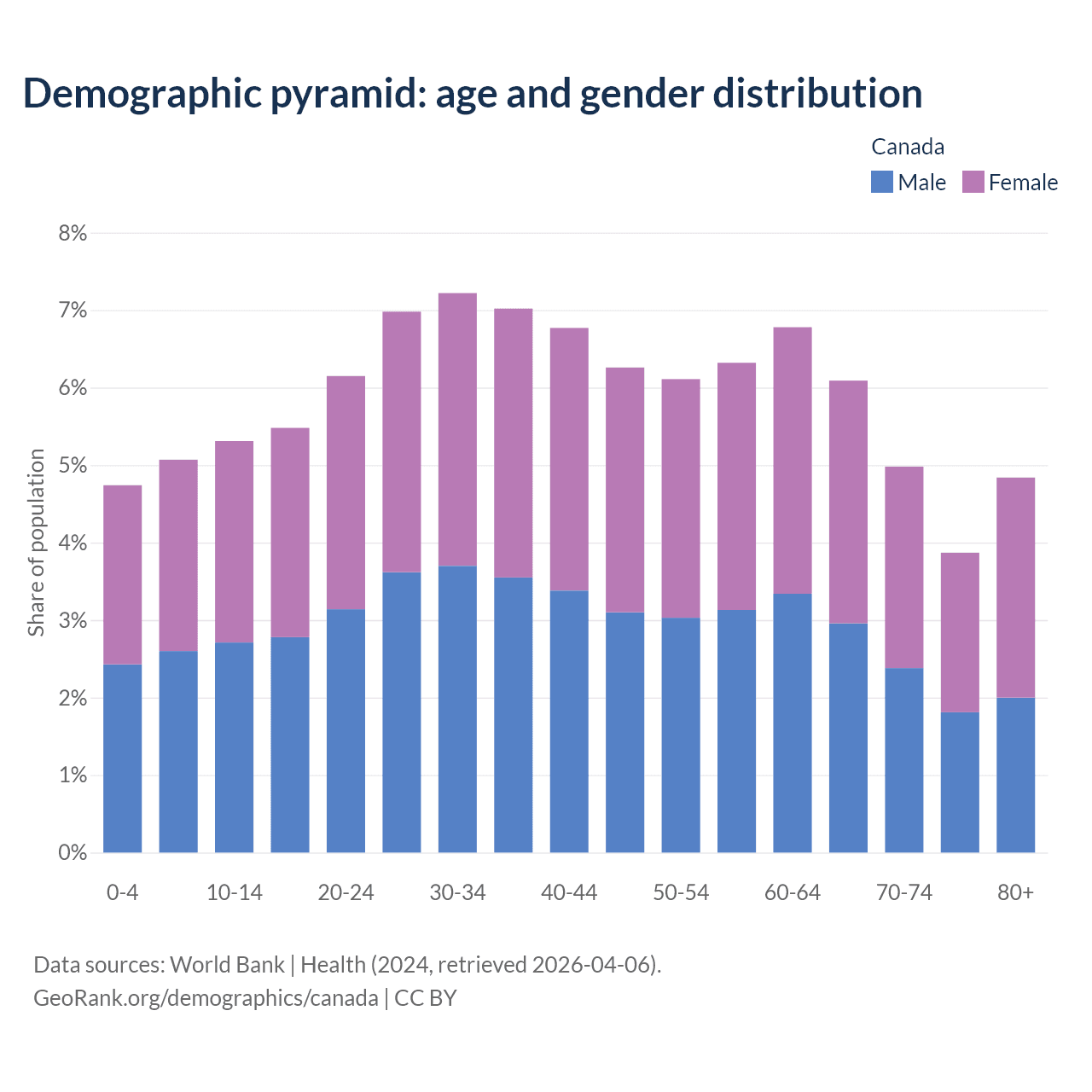 The share of older people aged 65 and over in Canada increased from 12.9% to 19.8% between 2004 and 2024.