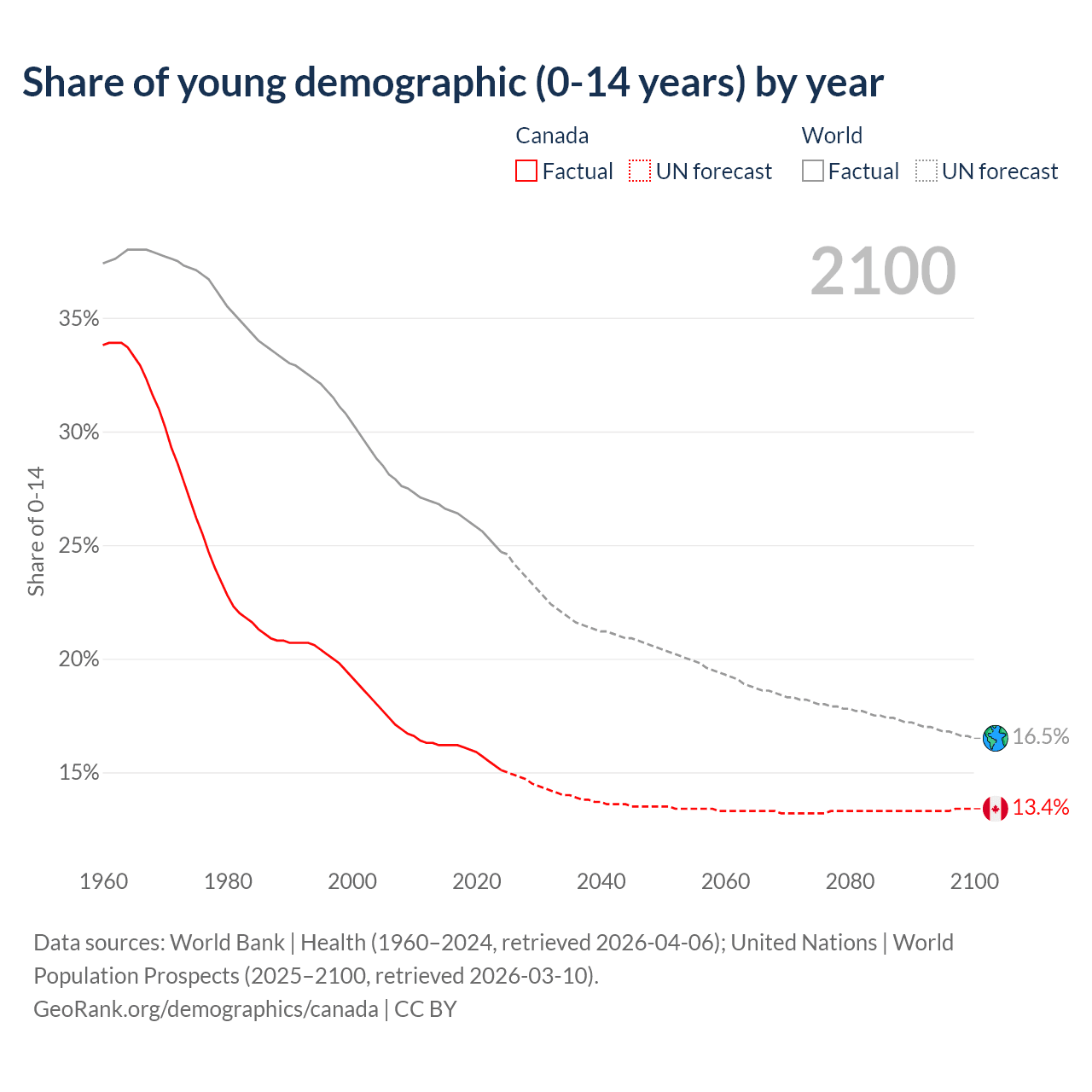 Median age in Canada, 1960–2100