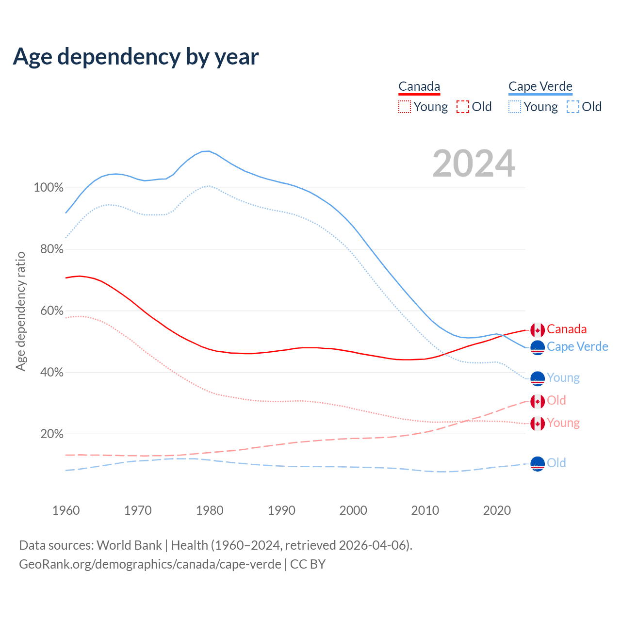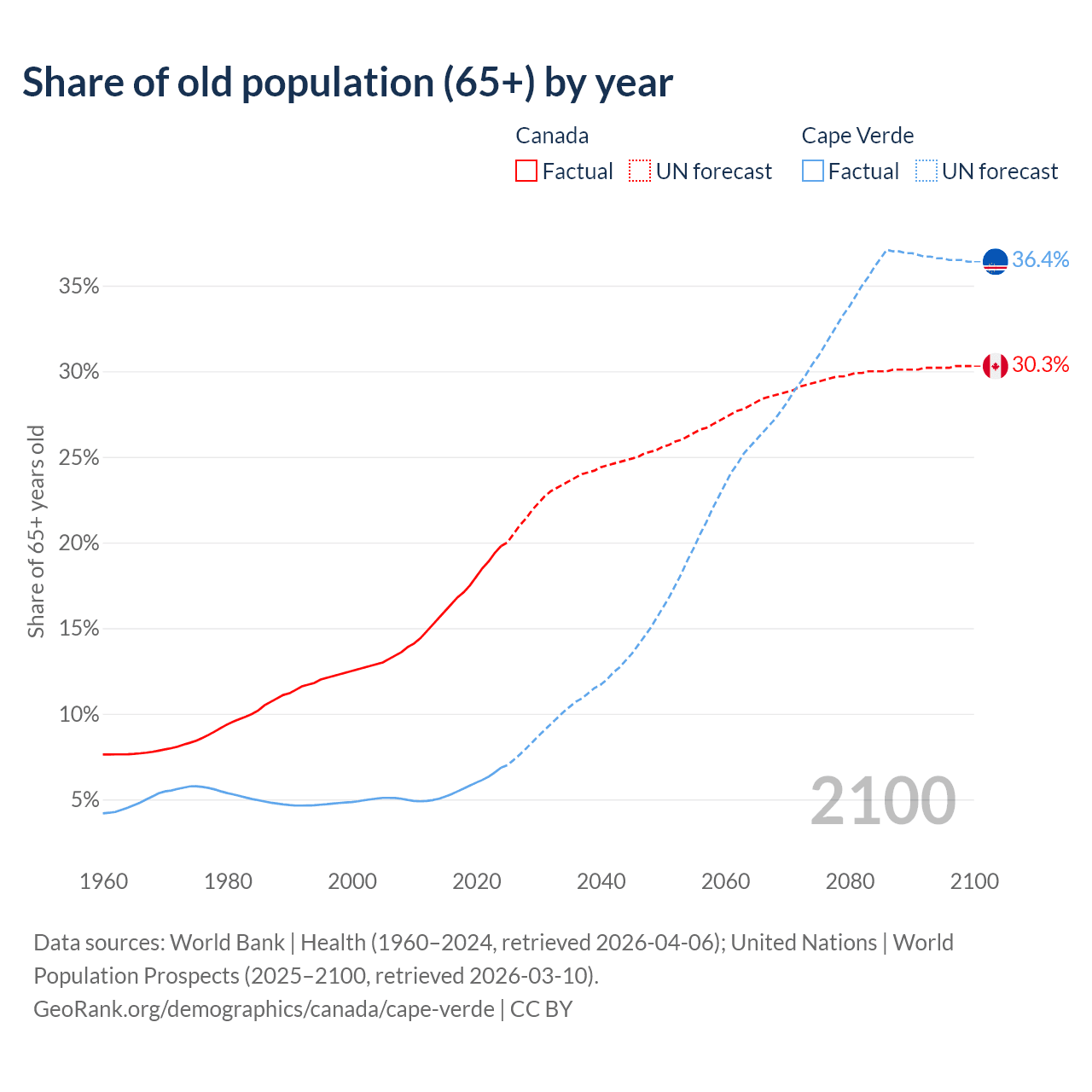 - The share of old-age demographic (65+) in Canada is 19.8% vs 6.86% in Cape Verde.