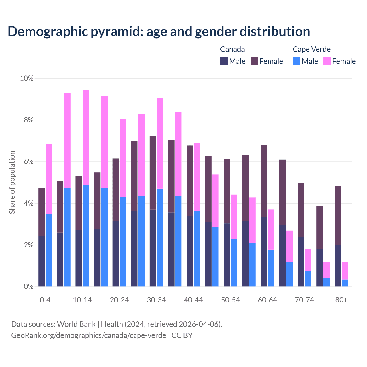 - As of 2026, the population of Canada is 42.2M vs 530K in Cape Verde - 79.5 times difference.