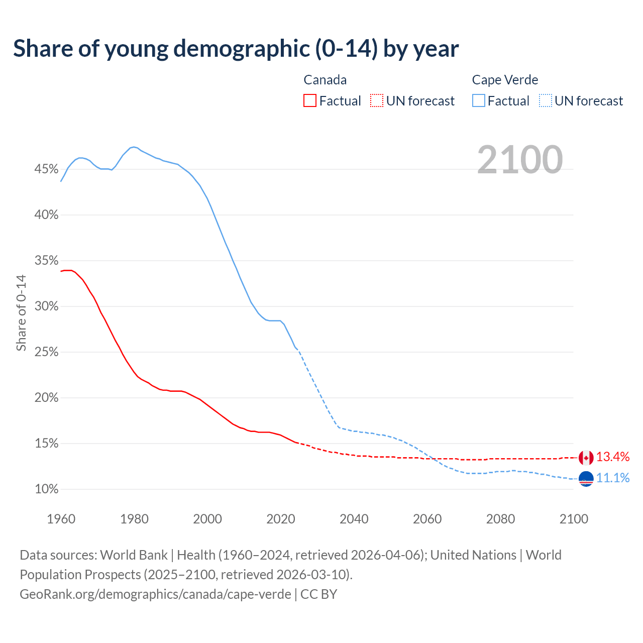 - The share of young demographic (0-15 years old) in Canada is 15.1% vs 25.5% in Cape Verde.