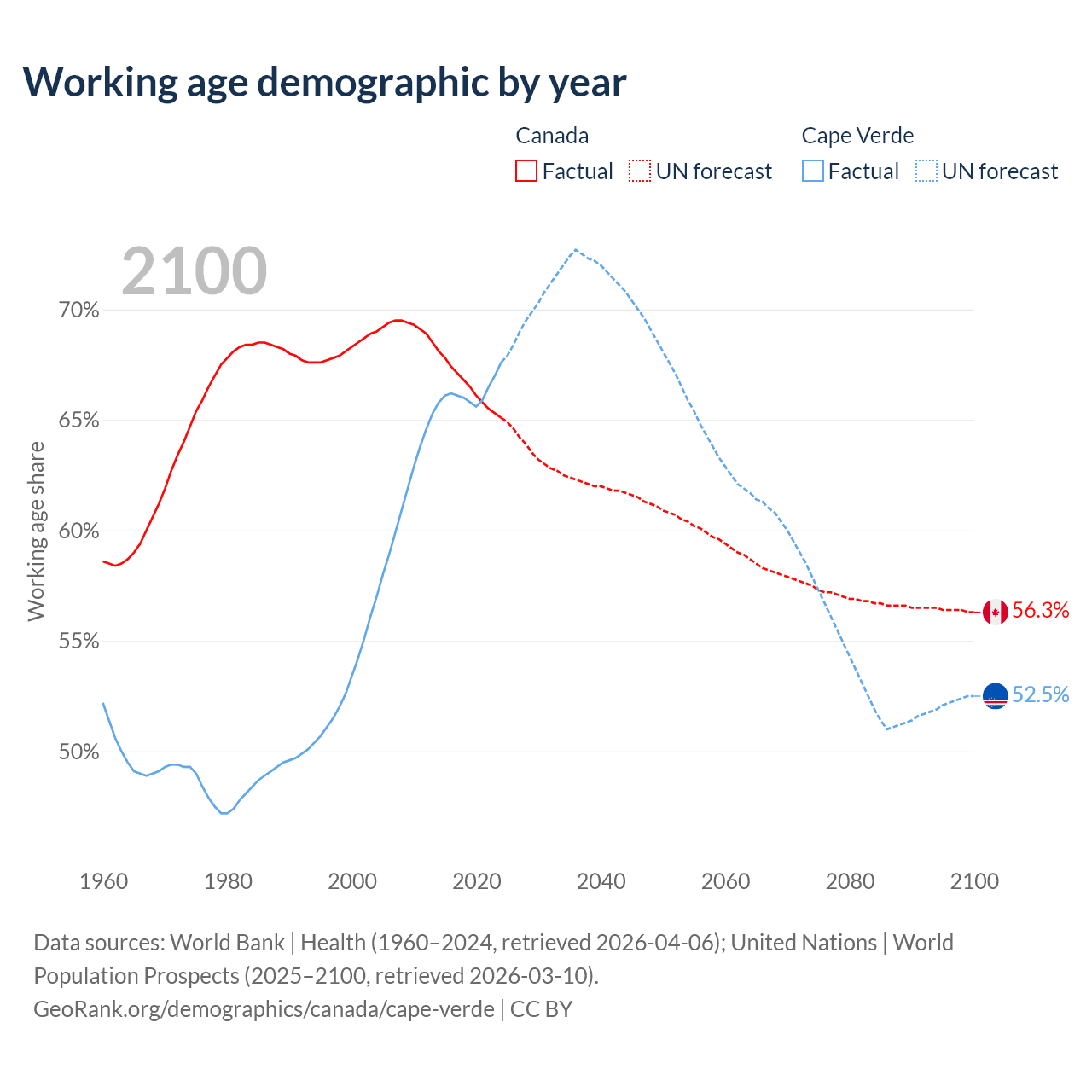 - Canada has 27.5M working age adults (aged 15-64) vs 359K in Cape Verde.