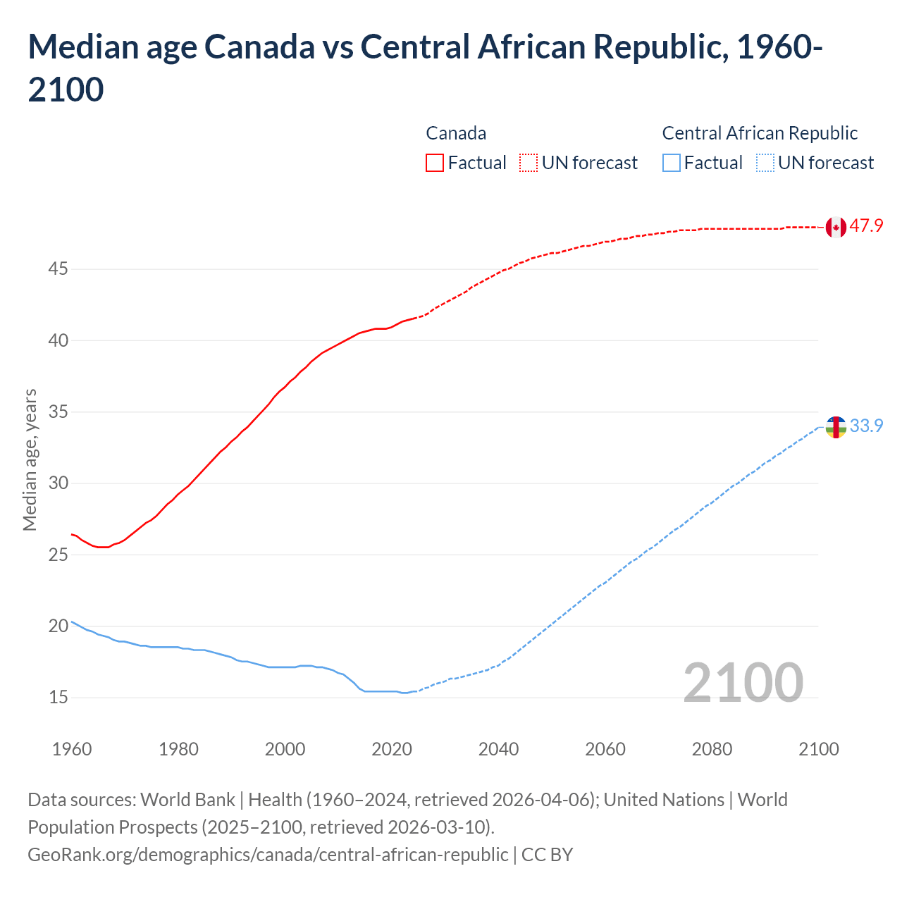 - The median age in Canada is 41.5 years compared to 15.4 years in the Central African Republic.