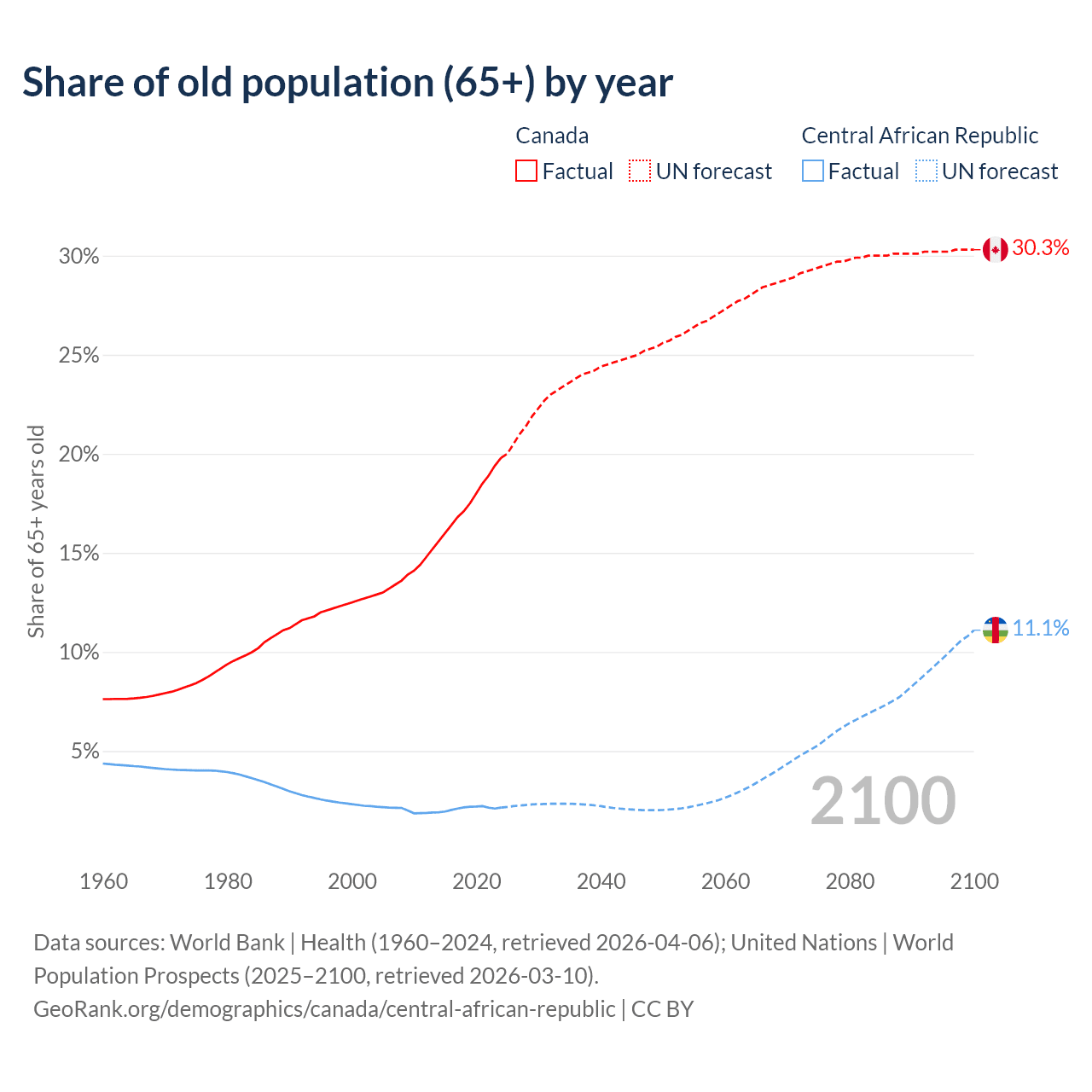 - The share of old-age demographic (65+) in Canada is 19.8% vs 2.15% in the Central African Republic.