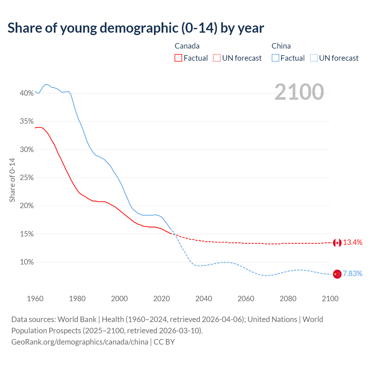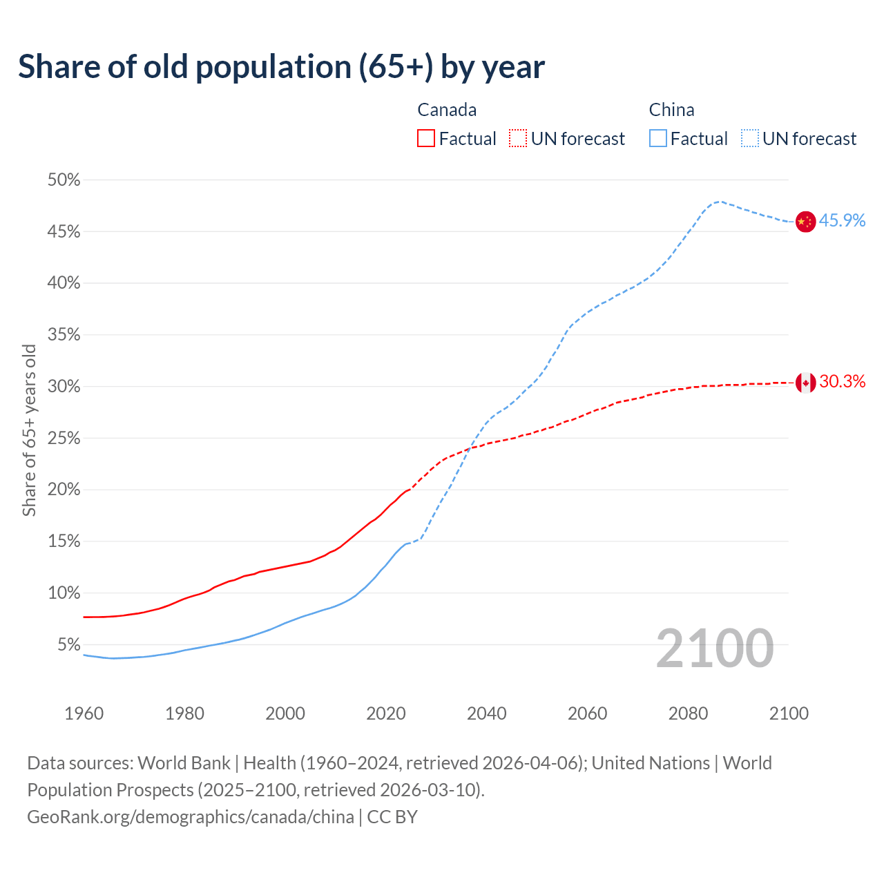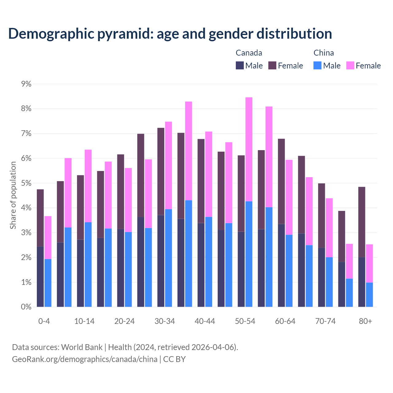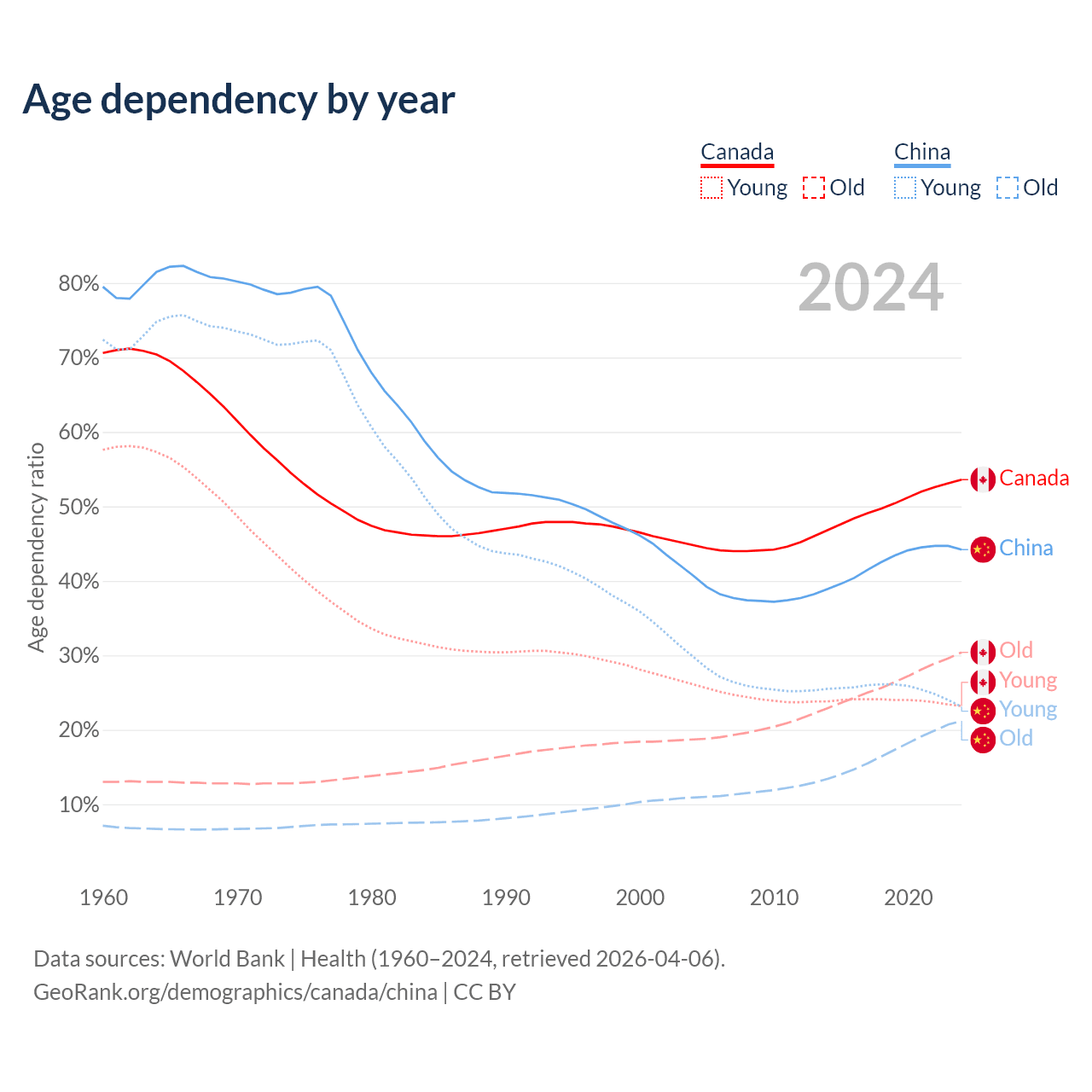 - Canada is ranked 38/196 by median age (oldest to youngest) vs 44/196 for China.