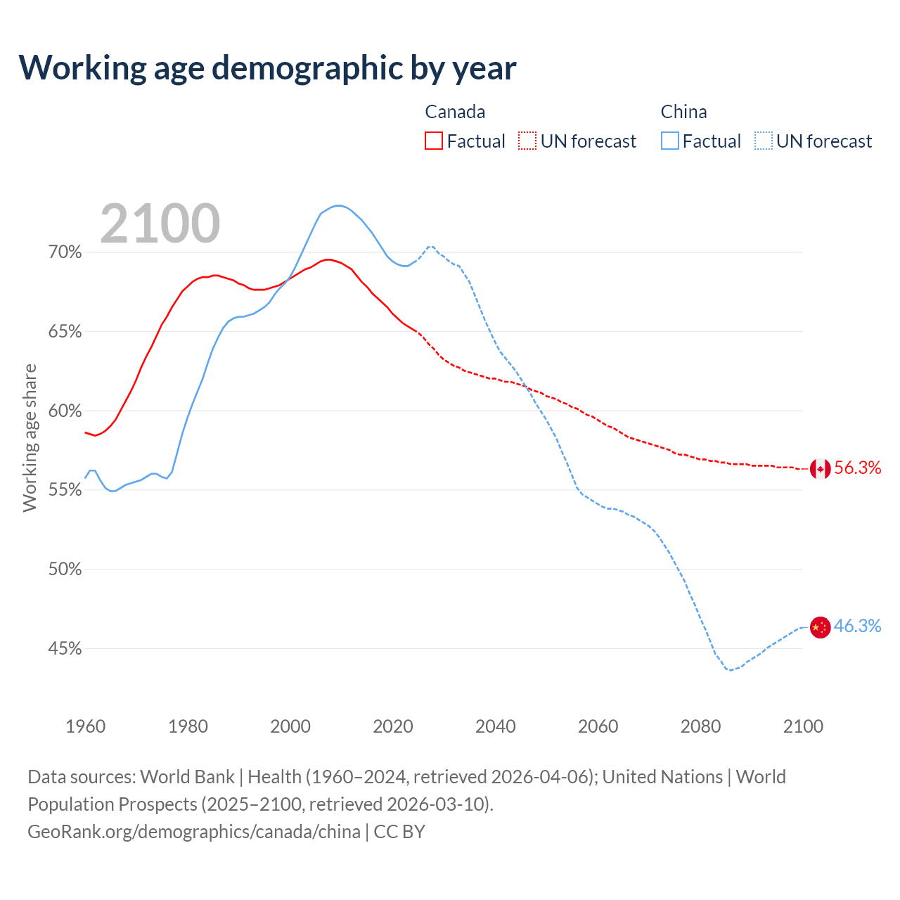- Canada has 27.5M working age adults (aged 15-64) vs 972M in China.