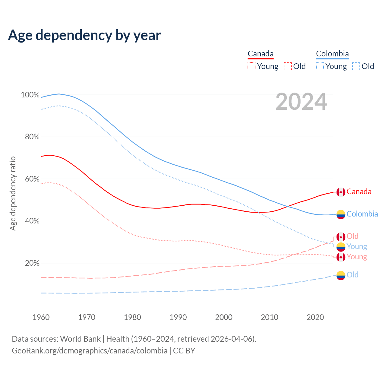 Data sources: World Bank | Health (1960–2024, retrieved 2026-04-06); U.S. Census Bureau (1960–2024, retrieved 2026-02-08).