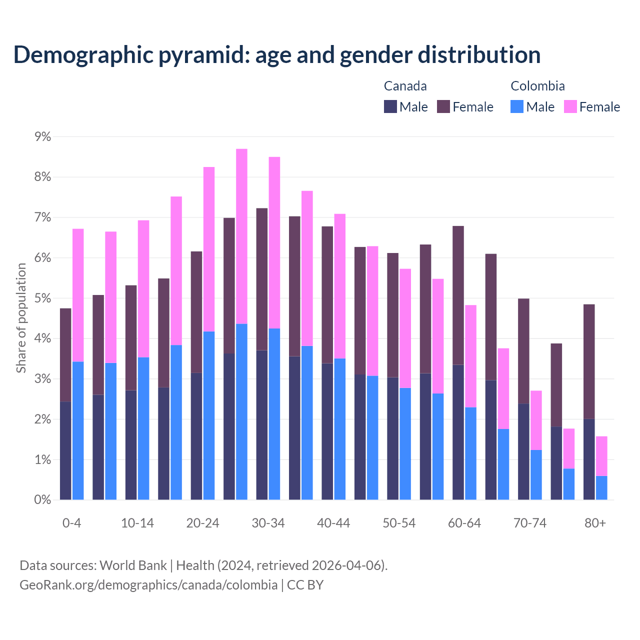 - Canada is ranked 38/196 by median age (oldest to youngest) vs 89/196 for Colombia.