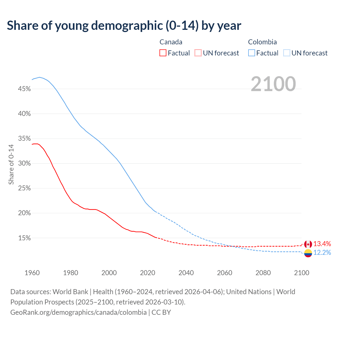- The share of young demographic (0-15 years old) in Canada is 15.1% vs 20.3% in Colombia.