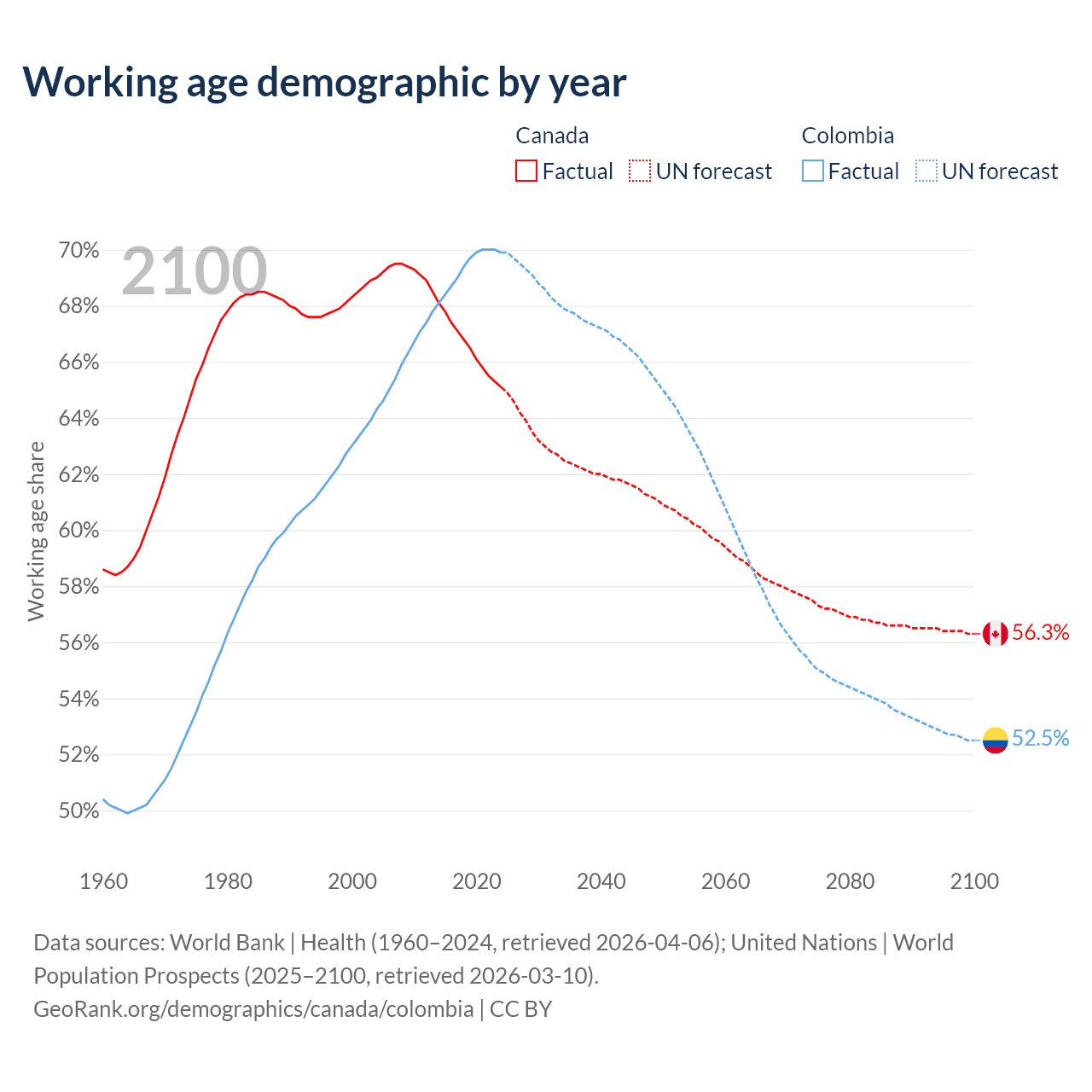 Median age Canada vs Colombia, 1960-2100