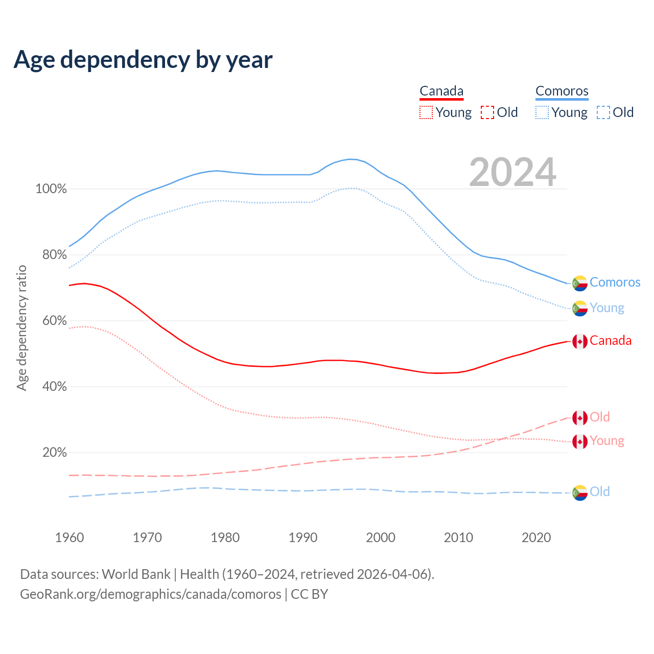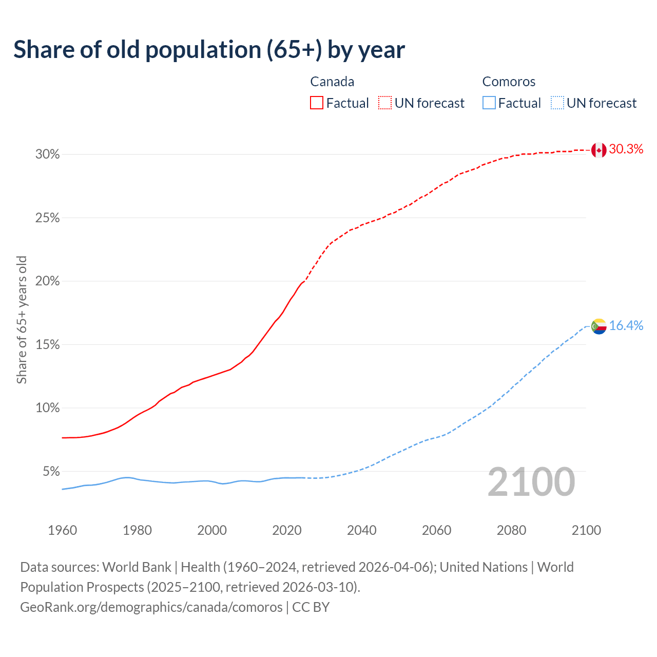 - The share of old-age demographic (65+) in Canada is 19.8% vs 4.47% in Comoros.