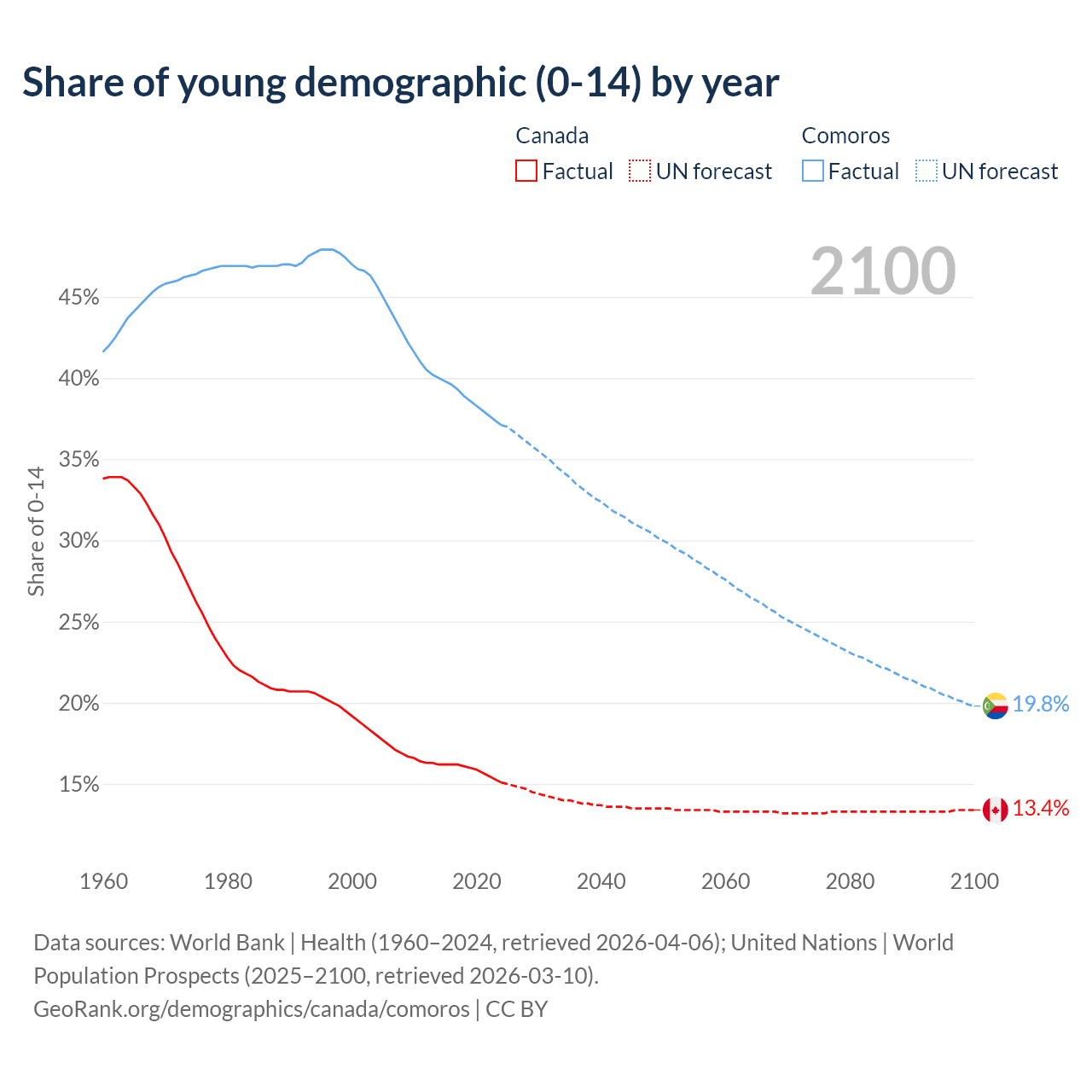 - The share of young demographic (0-15 years old) in Canada is 15.1% vs 37.1% in Comoros.