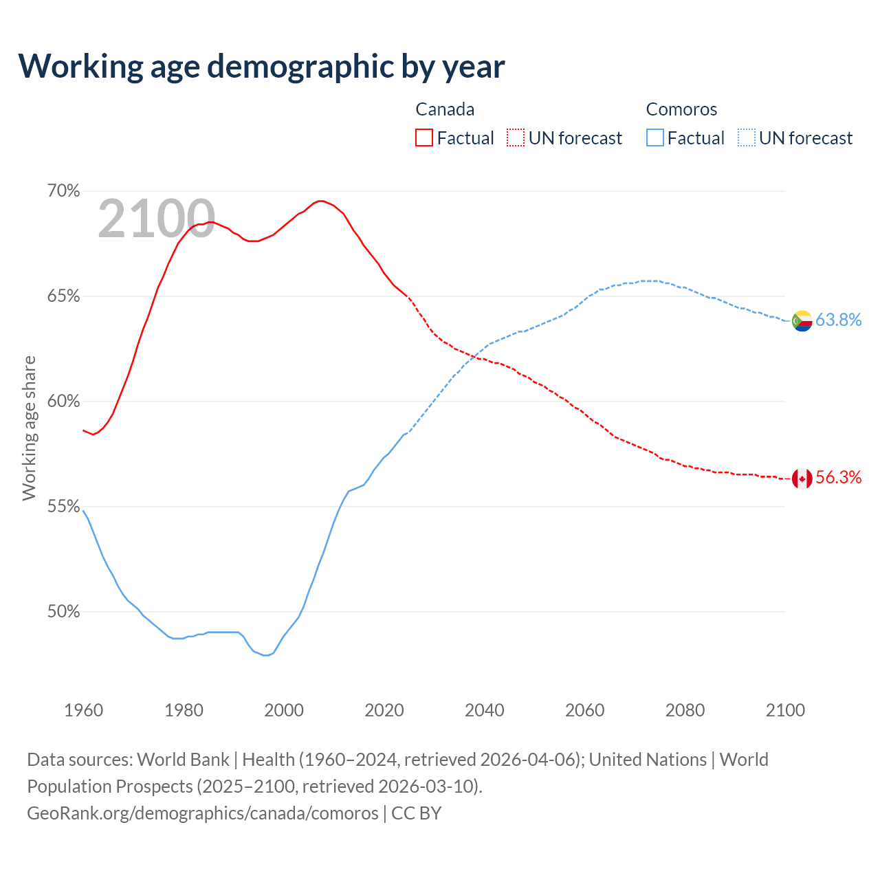 - Canada has 27.5M working age adults (aged 15-64) vs 528K in Comoros.