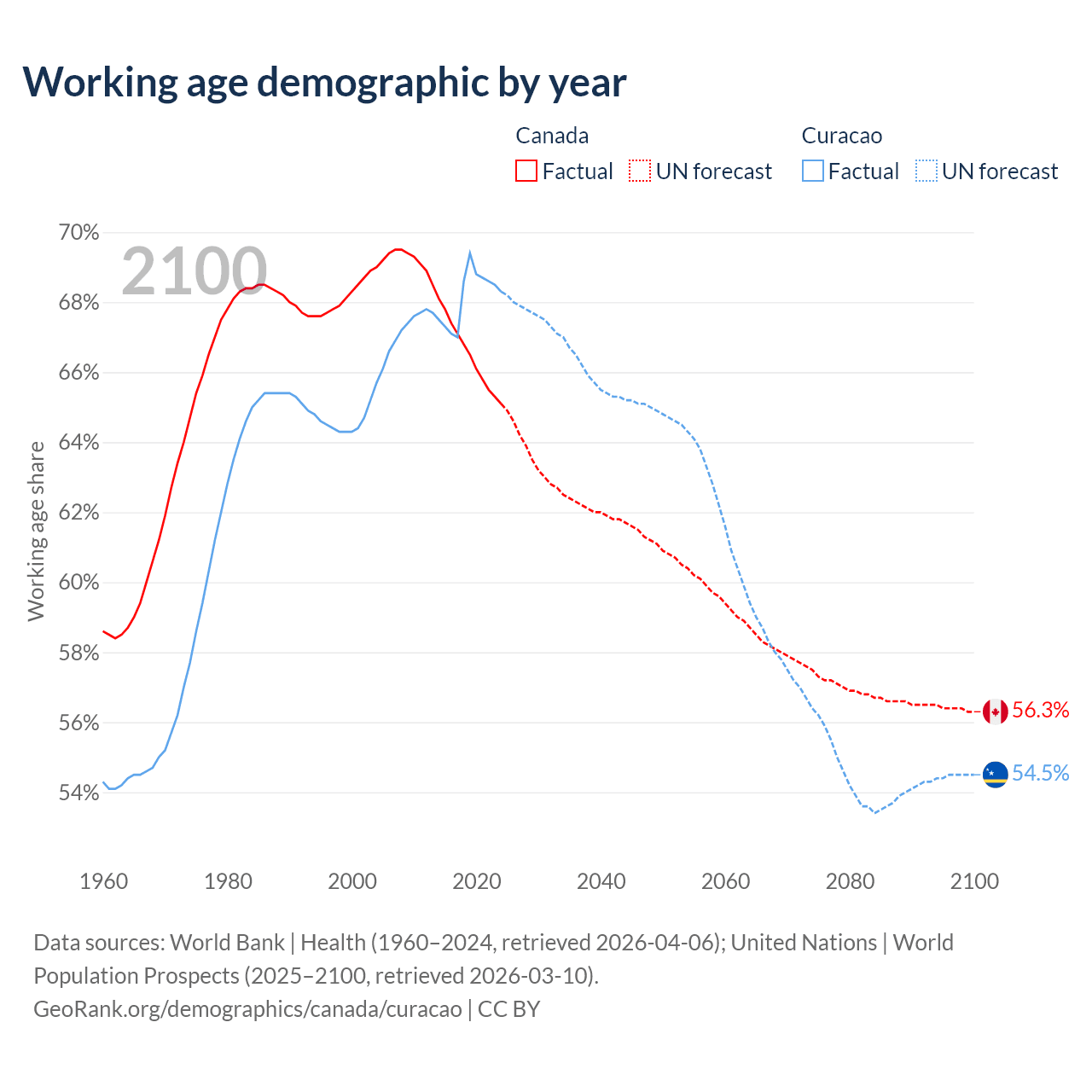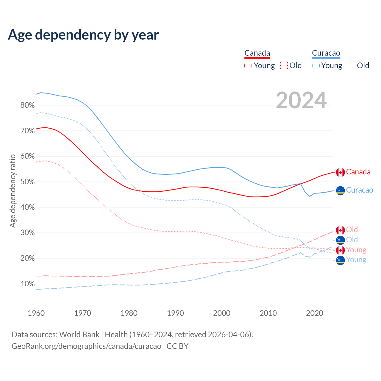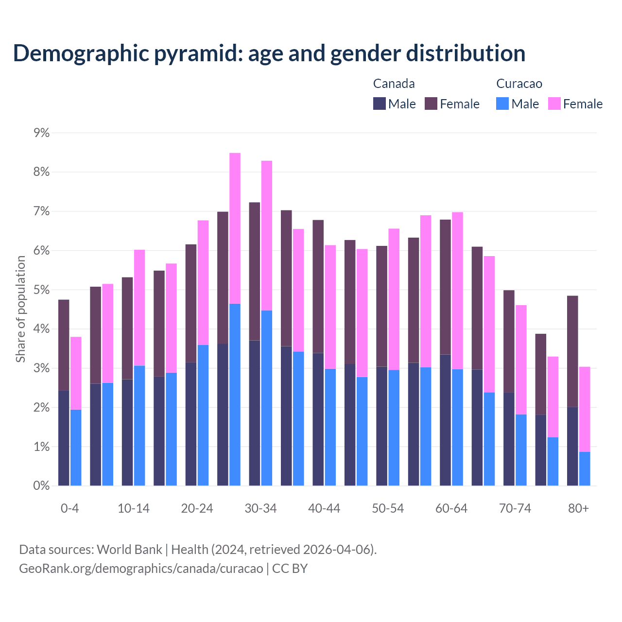 - The share of old-age demographic (65+) in Canada is 19.8% vs 16.8% in Curacao.